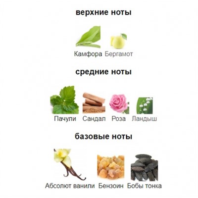 Верхние ноты: Камфора и Бергамот; средние ноты: Пачули, Роза, Сандал и Ландыш; базовые ноты: Абсолют ванили, Бензоин и Бобы тонка. Комментарии к товару
