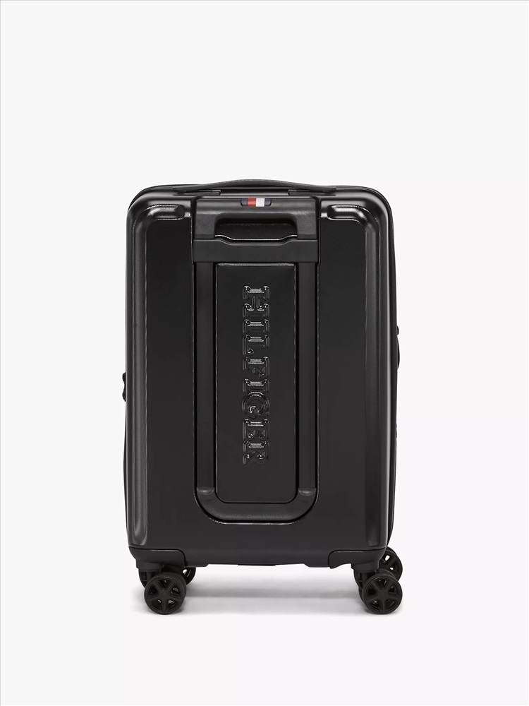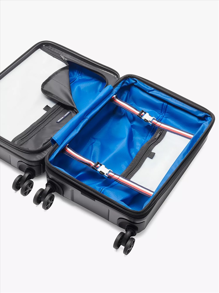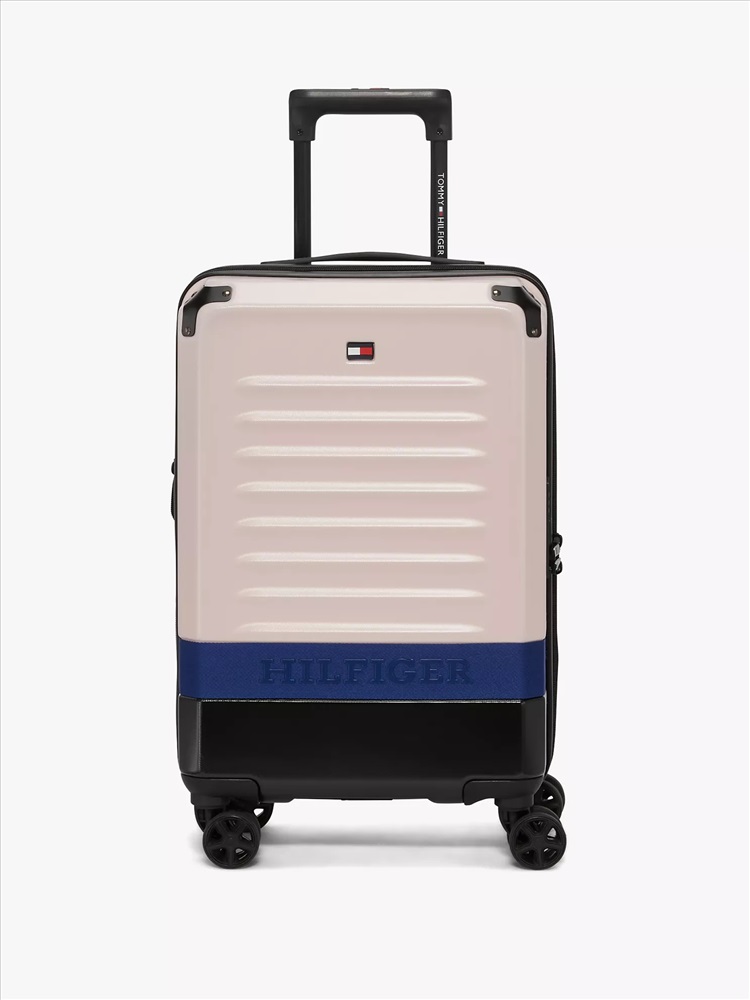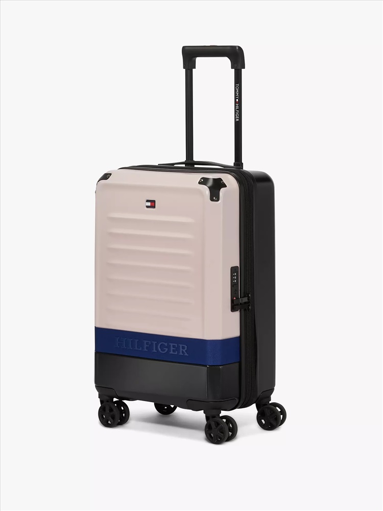 Tommy Hilfiger luggage. Our upright roller suitcase is easy to spot on the carousel thanks to the colorblock finish and the Hilfiger flag badge. Constructed of durable composite polycarbonate material, this bag is ready to take on the rigors of travel. Eight multi-directional spinner wheels provide effortless rolling to make traveling a breeze.