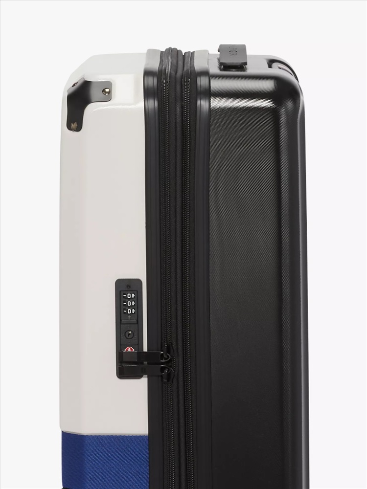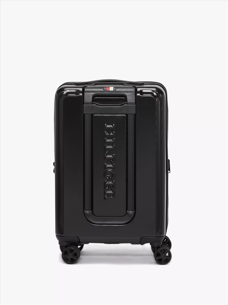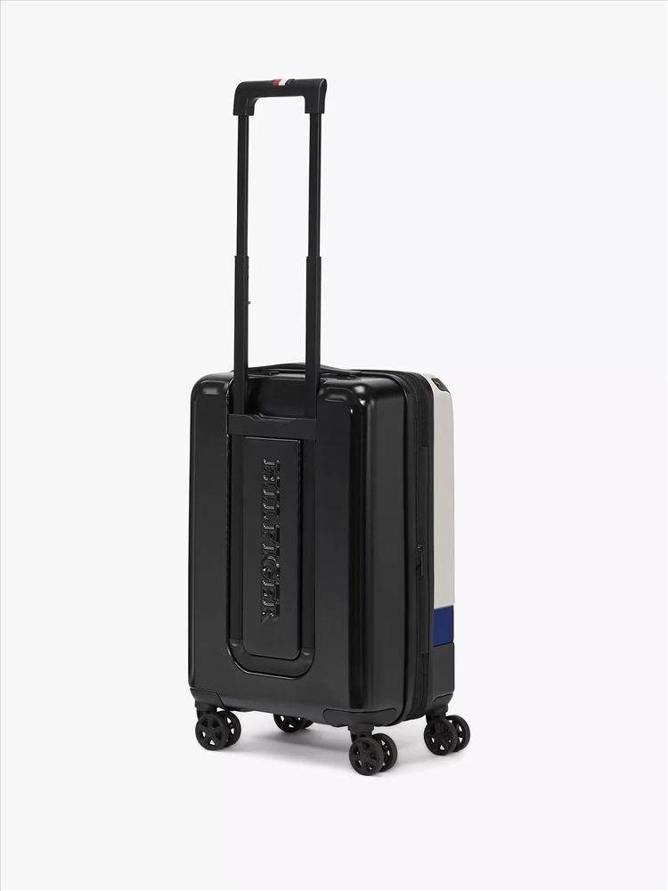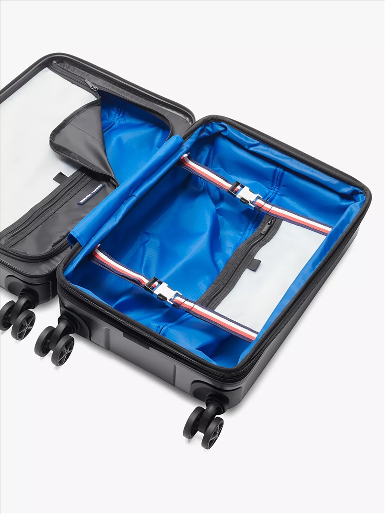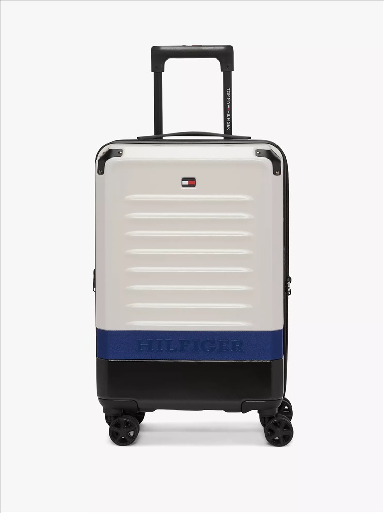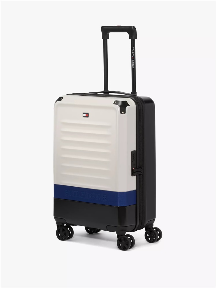 Tommy Hilfiger luggage. Our upright roller suitcase is easy to spot on the carousel thanks to the colorblock finish and the Hilfiger flag badge. Constructed of durable composite polycarbonate material, this bag is ready to take on the rigors of travel. Eight multi-directional spinner wheels provide effortless rolling to make traveling a breeze.