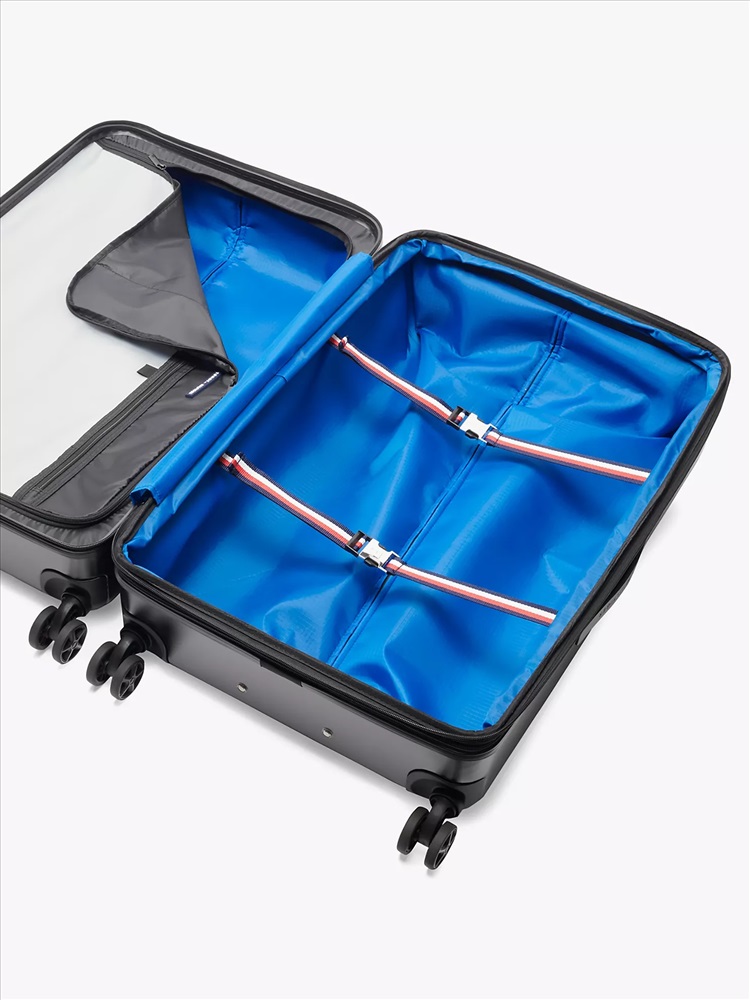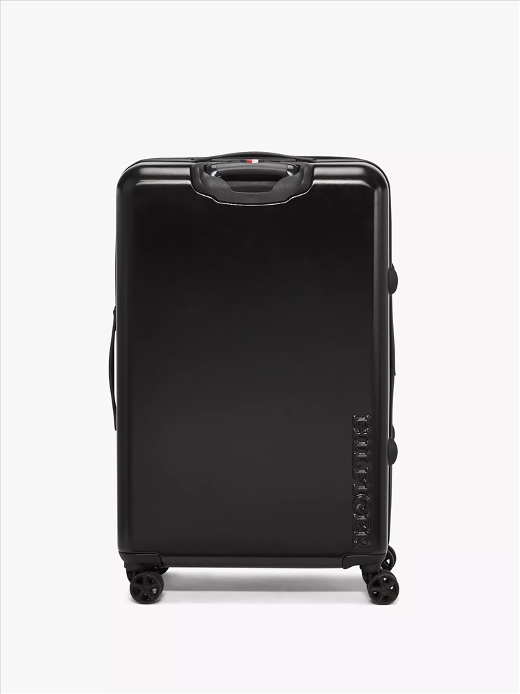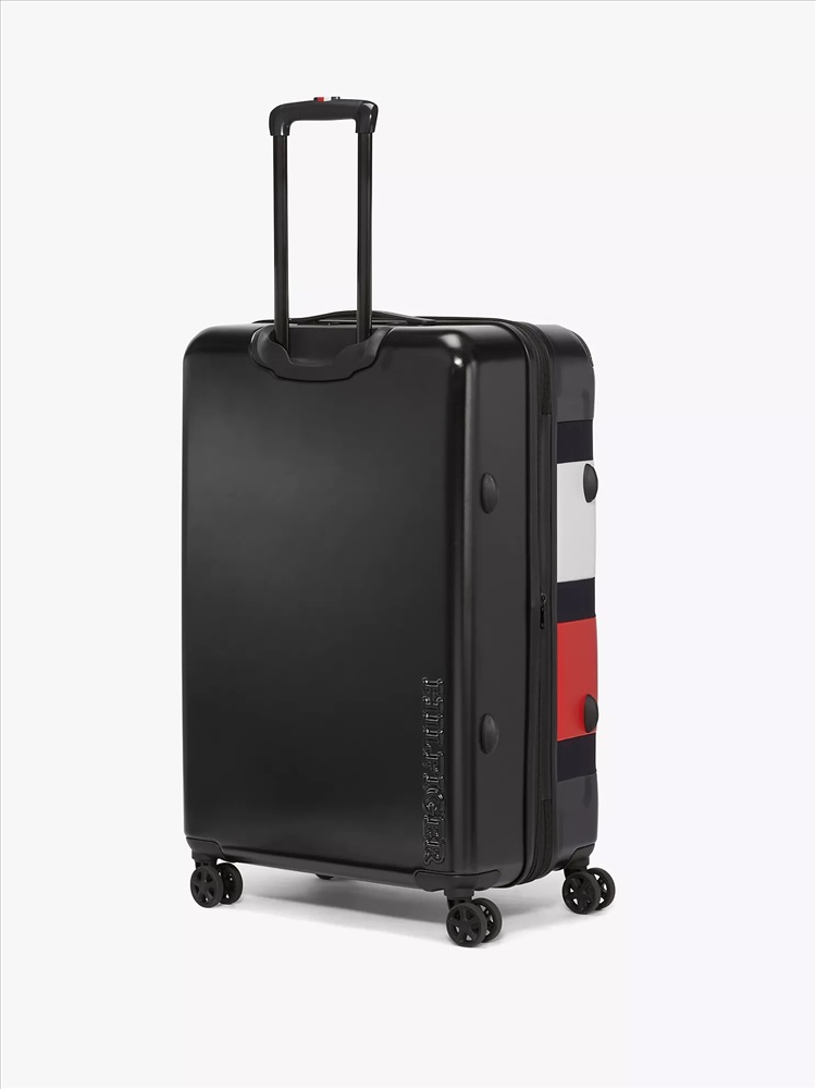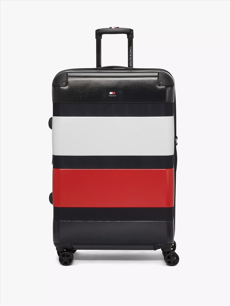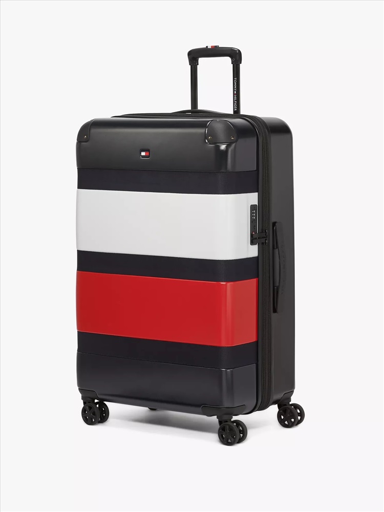 Tommy Hilfiger luggage. Our upright roller suitcase is made from durable composite polycarbonate material and is ready to take on the rigors of travel. Eight multi-directional spinner wheels provide effortless rolling, to make traveling a breeze. Choose a bag that stands out on the carousel in our signature colors, or one in an understated, minimalist black finish.