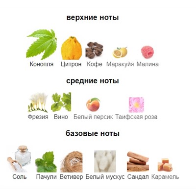 Верхние ноты: Конопля, Цитрон, Кофе, Маракуйя и Малина; средние ноты: Фрезия, Вино, Белый персик и Таифская роза; базовые ноты: Соль, Пачули, Ветивер, Белый мускус, Сандал и Карамель. Комментарии к товару