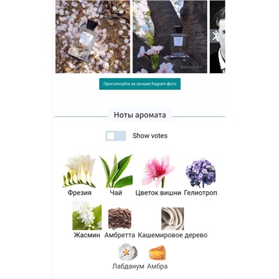 Композиция состоит из нот жасминового чая, фрезии, вишни, гелиотропа, амбры, кашемирового дерева и семян амбретты.