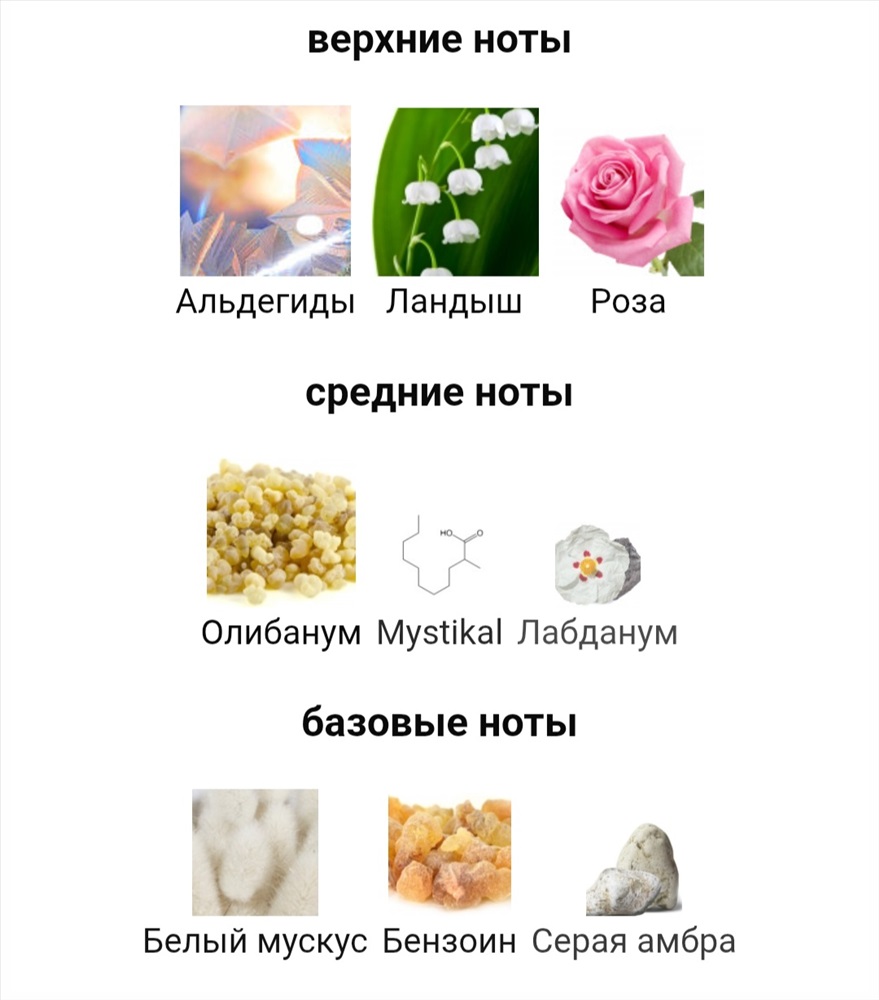 Верхние ноты: Альдегиды, Ландыш и Роза; средние ноты: Олибанум, Mystikal и Лабданум; базовые ноты: Белый мускус, Бензоин и Серая амбра.
