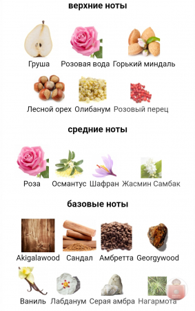 Верхние ноты: Груша, Розовая вода, Горький миндаль, Лесной орех, Олибанум и Розовый перец; средние ноты: Роза, Османтус, Шафран и Жасмин Самбак; базовые ноты: Akigalawood, Сандал, Амбретта, Georgywood, Ваниль, Лабданум, Серая амбра и Нагармота.