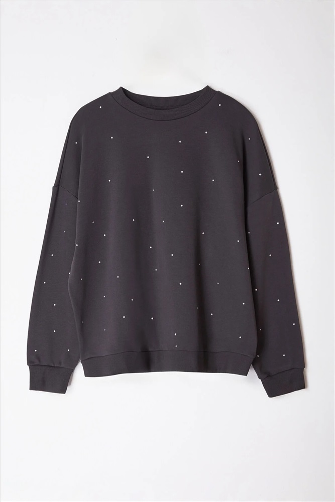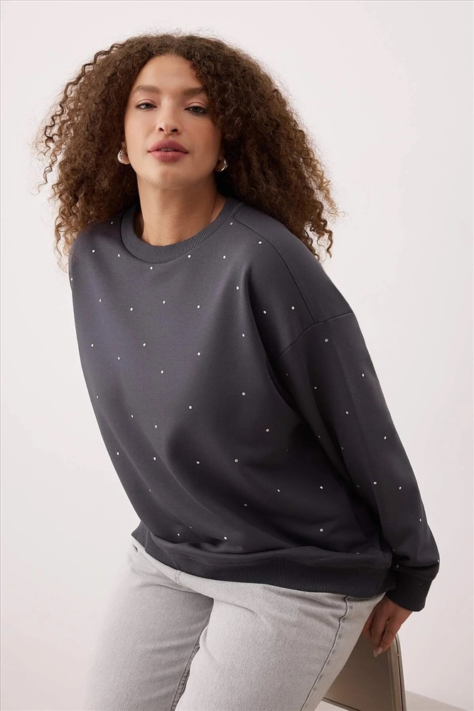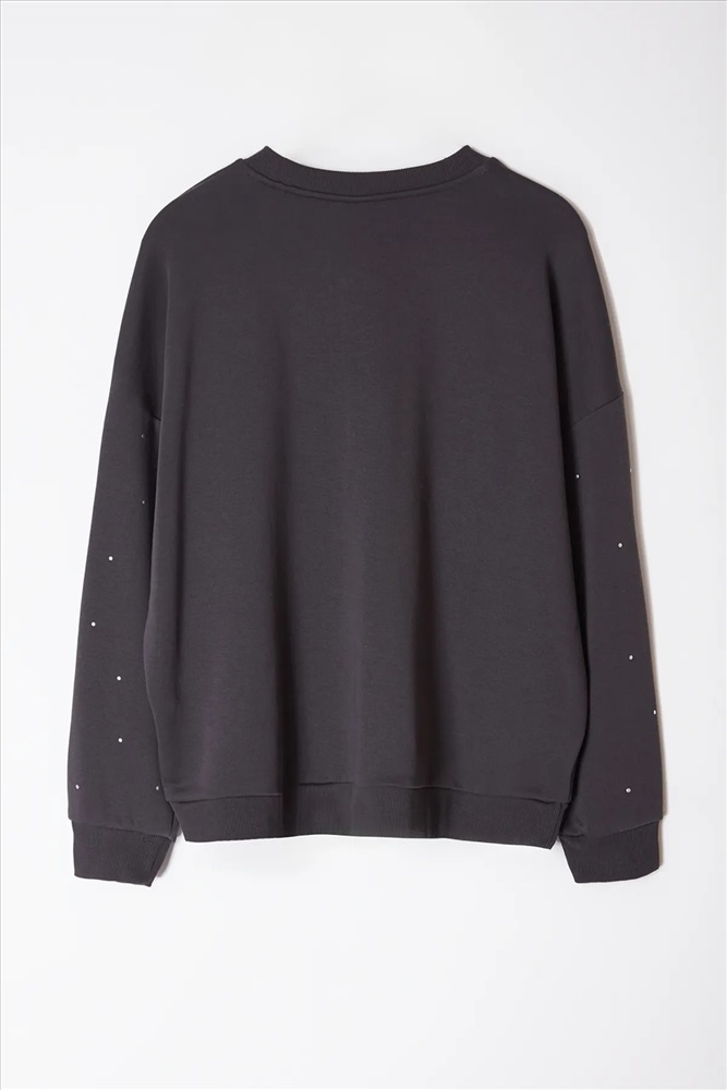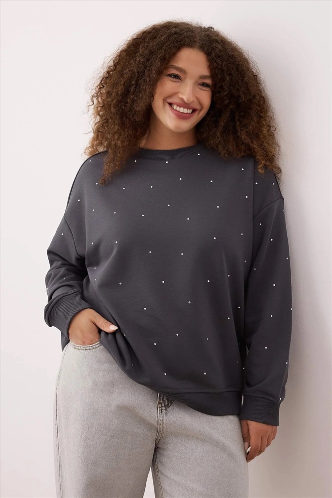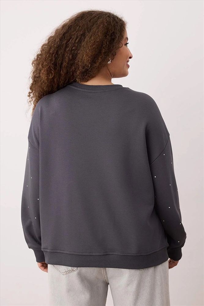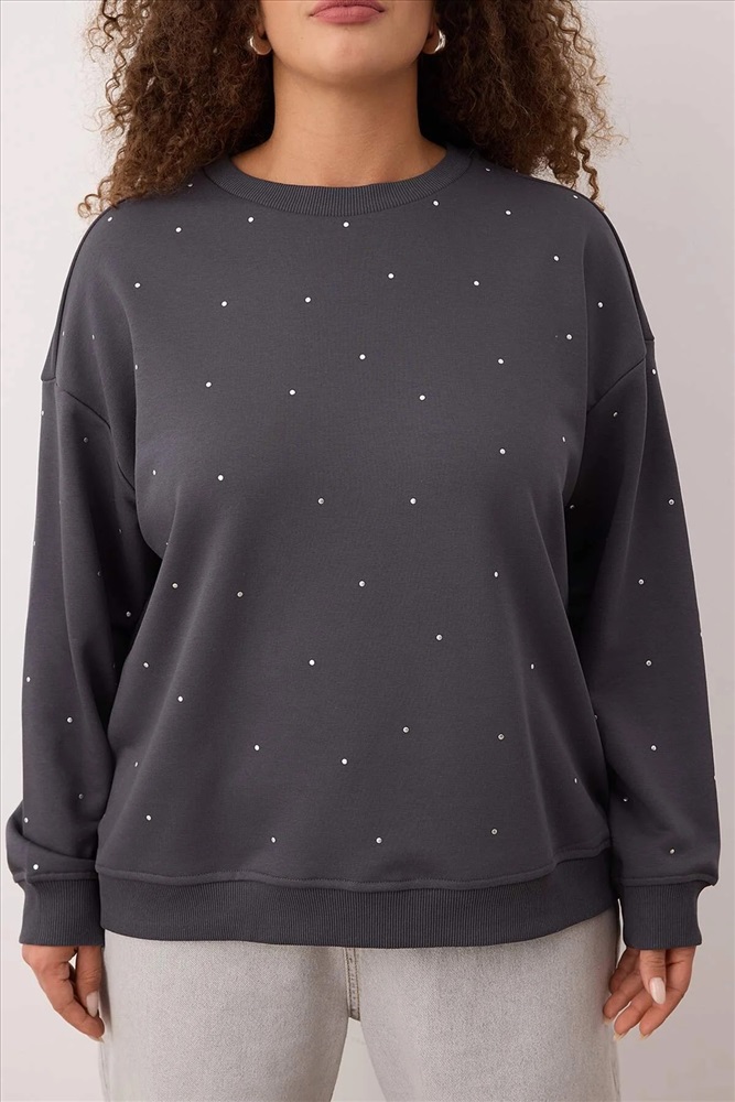 Antrasit Kalın Taşlı Detaylı Örme Sweatshirt Büyük Beden Sweatshirt TBBAW24SW00000