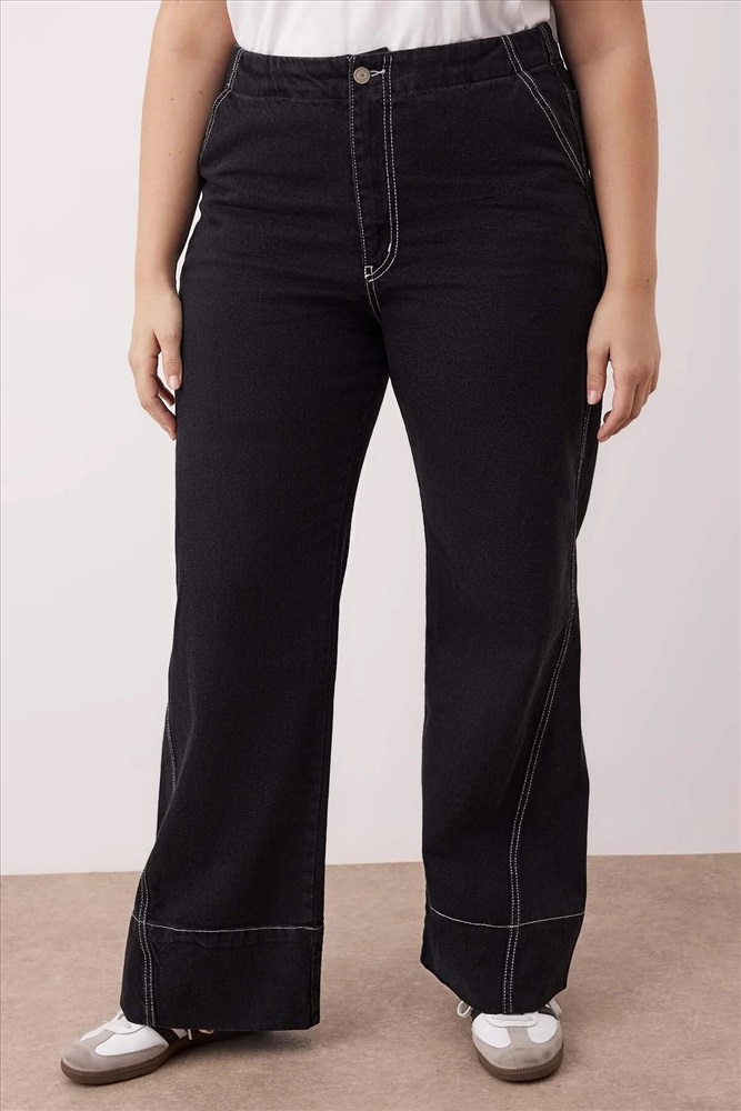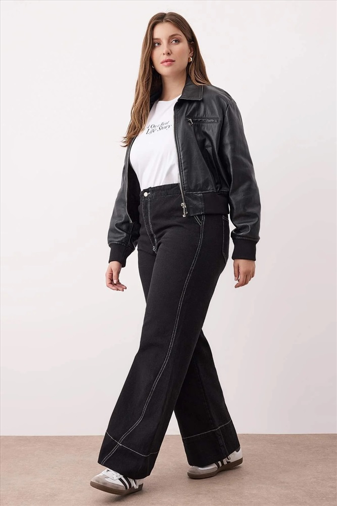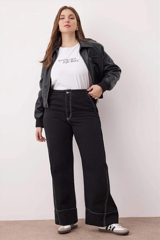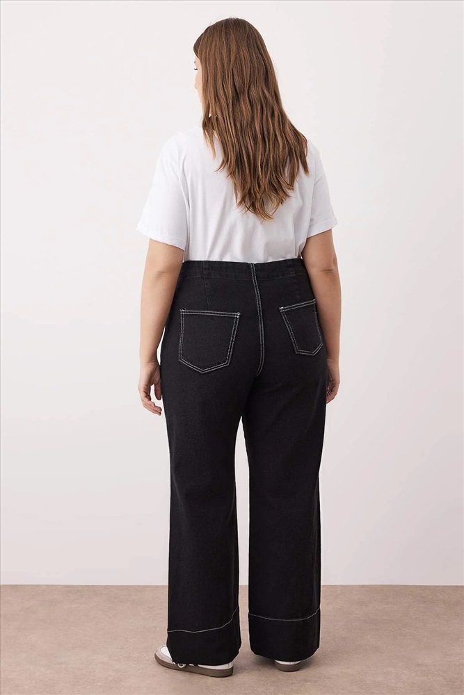 Antrasit Yüksek Bel Dikiş Detaylı Geniş Paça Büyük Beden Wide Leg Jeans TBBAW26CJ00017
