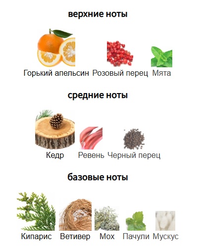 Верхние ноты: Горький апельсин, Розовый перец и Мята; средние ноты: Кедр, Ревень и Черный перец; базовые ноты: Кипарис, Ветивер, Мох, Пачули и Мускус.