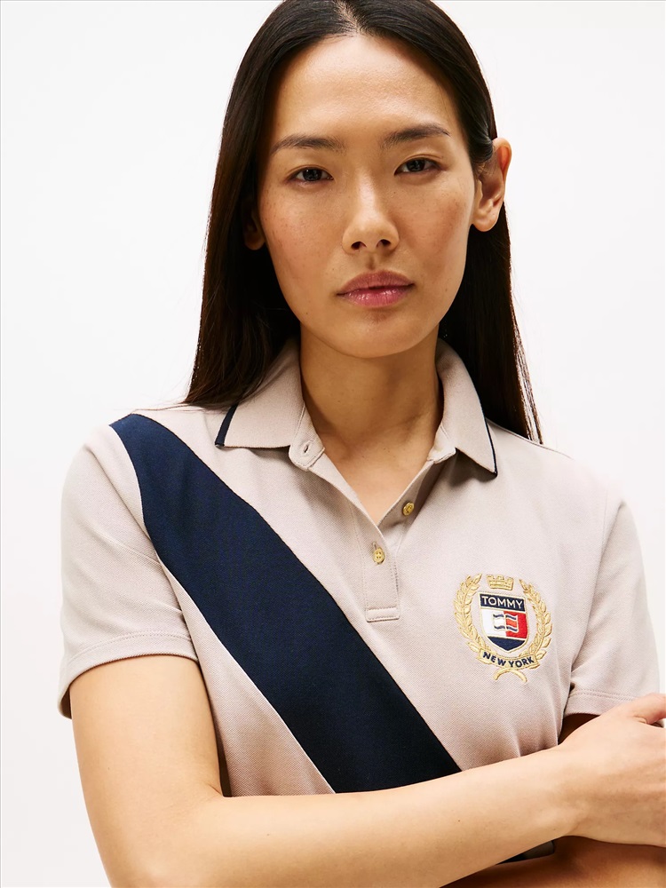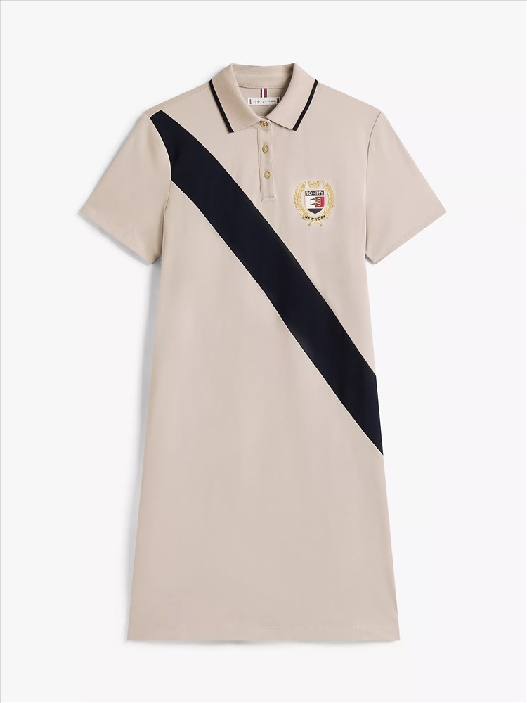 Tommy Hilfiger women's dress. Soft, stretch cotton in an easy cut makes this sporty polo dress a comfortable pick. The bold diagonal banner stripe makes it a memorable one.