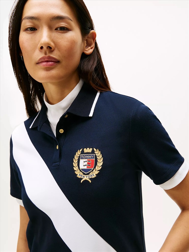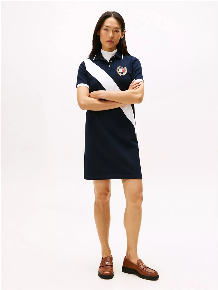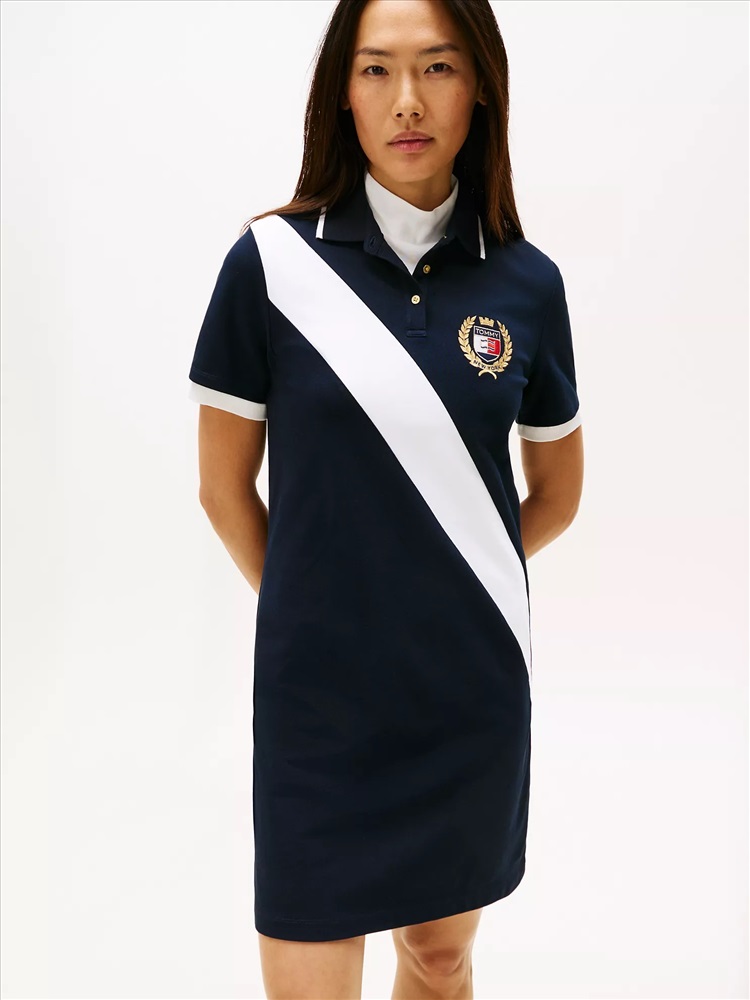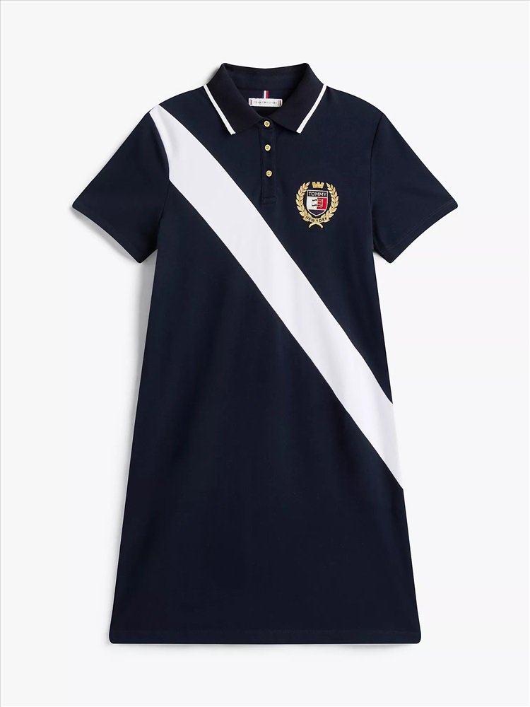 Tommy Hilfiger women's dress. Soft, stretch cotton in an easy cut makes this sporty polo dress a comfortable pick. The bold diagonal banner stripe makes it a memorable one.