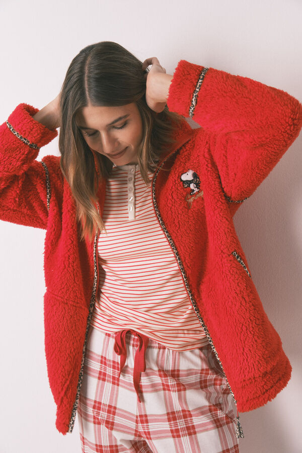 - Con cuello alto, cremallera frontal, bolsillos tipo "canguro" con botón y bordado de Snoopy en el pecho.