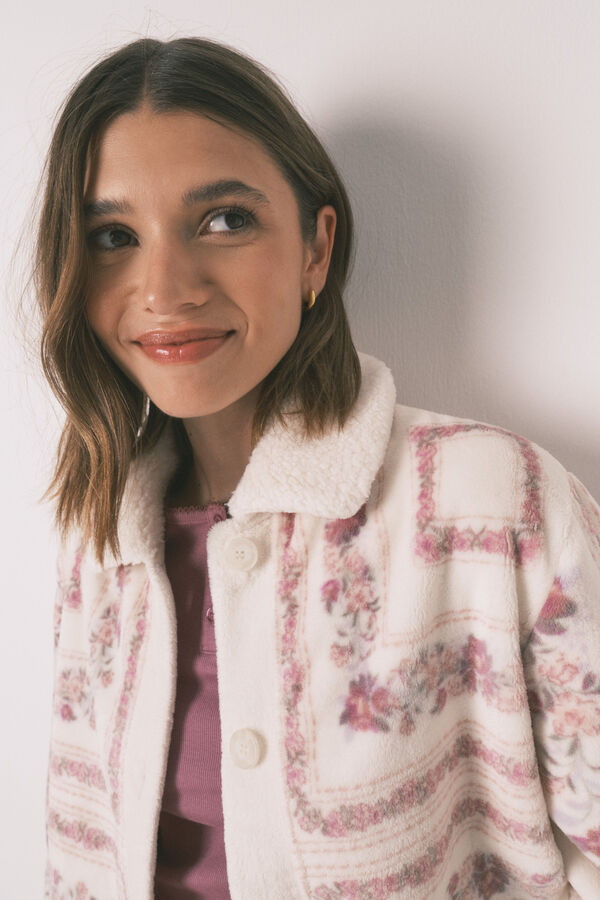 Bata corta de manga larga confeccionada en tejido de polar extra suave, de doble faz. Con estampado allover de cenefas florales, con contraste liso en cuello y tapeta central. Abrochada con botones a contraste. Ideal para momentos relajados o como parte de tu look diario.