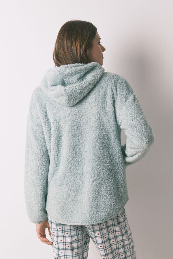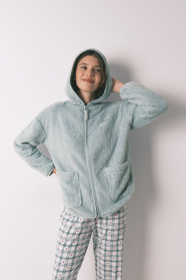 Bata corta confeccionada en tejido de pelo "fluffy", con detalle de lurex plateado. Ideal para estar en casa calentita y con estilo.