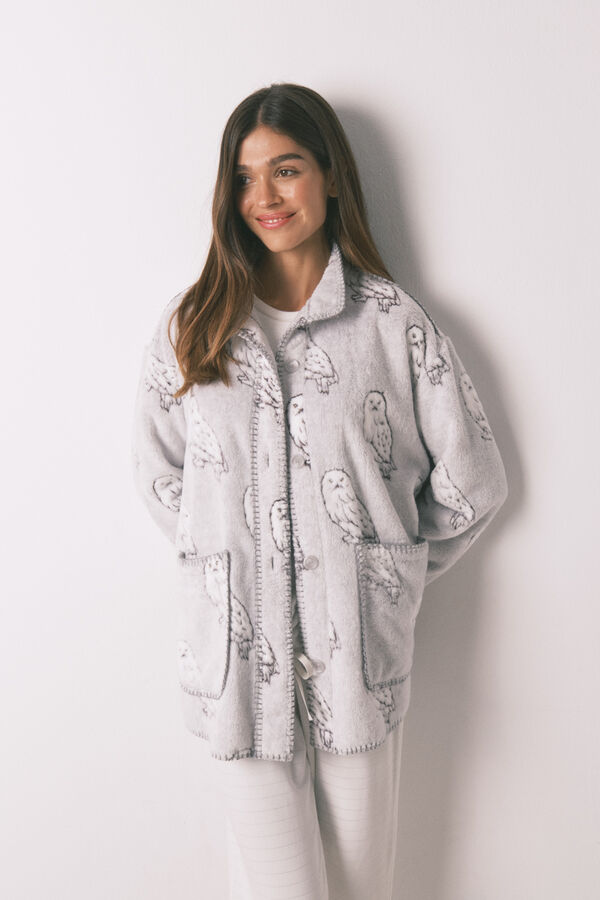 Bata corta confeccionada en tejido polar de pelo súper suave, con bordados de Hedwig allover. Ideal para estar en casa calentita y con estilo.