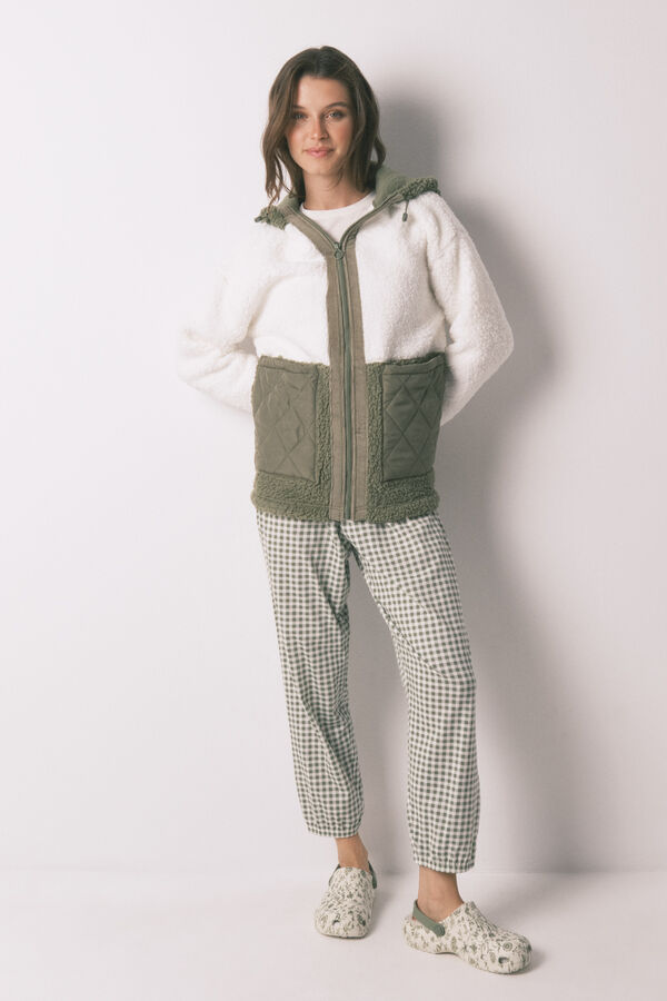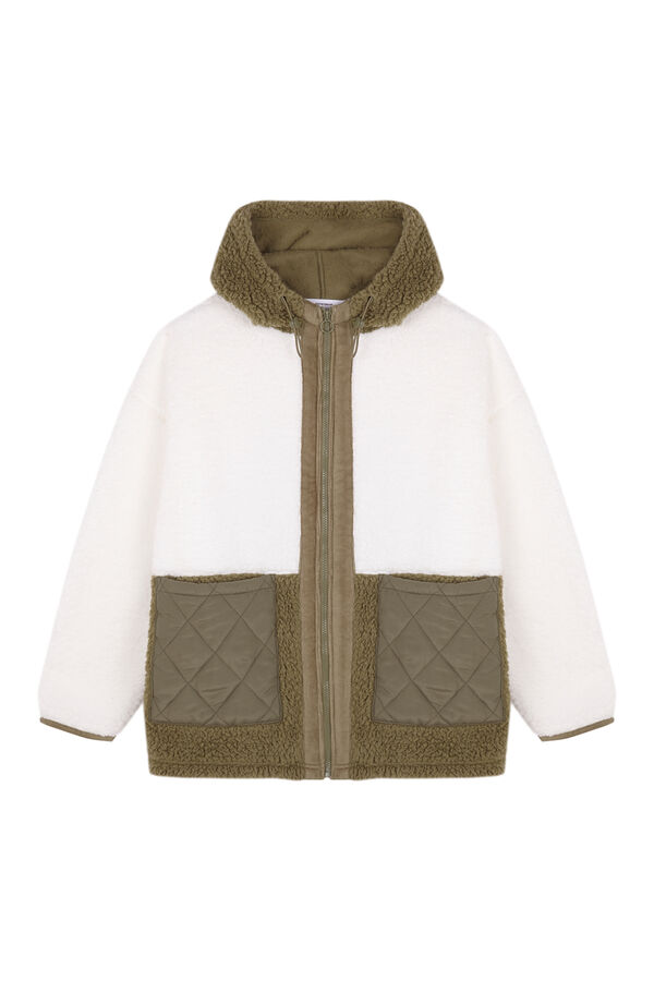 Bata midi de manga larga en color block en crudo y verde en tejido de borreguito. Con capucha a contraste regulable con cordón a tono, bolsillos de patch acolchados de nylon, vivo a contraste en puños, abertura central y bajo de prenda. Abrochado con cremallera central a tono. Ideal para momentos relajados o como parte de tu look diario.