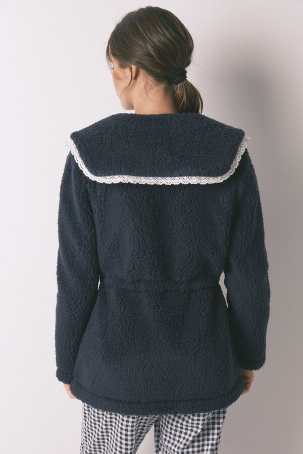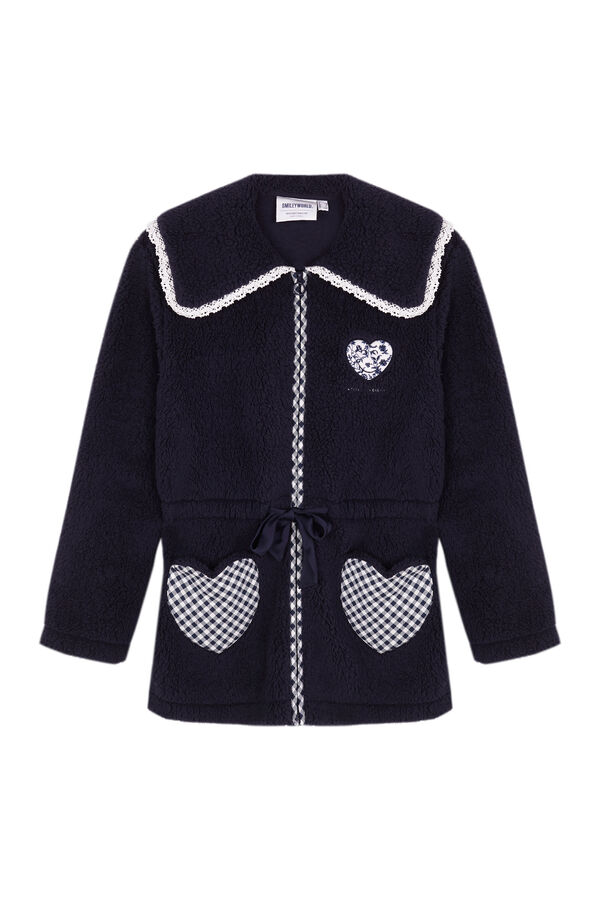 Bata lisa midi en tejido de borreguito. Con cuello bebé muy pronunciado con pequeño volante blanco en contorno. Bolsillos de patch en forma de corazón con estampado de cuadros y posicionado de Smiley en forma de corazón sobre el pecho. Bata ceñida en cintura mediante cordón insertado a tono. Ideal para momentos relajados o como parte de tu look diario.