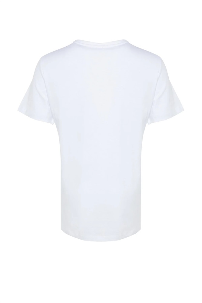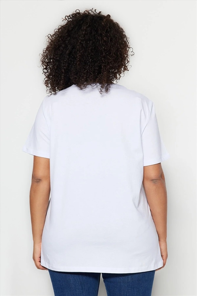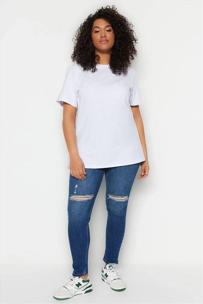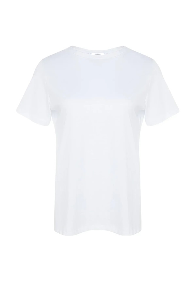 Beyaz Boyfriend Bisiklet Yaka Yırtmaçlı %100 Pamuk Örme T-Shirt TBBSS22BF0031