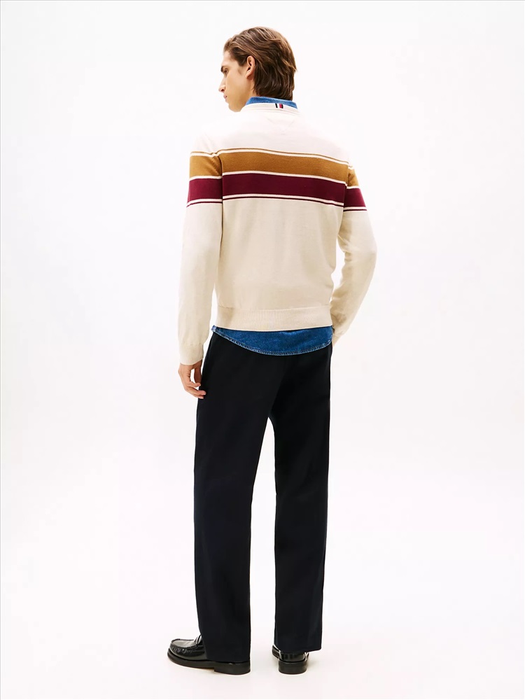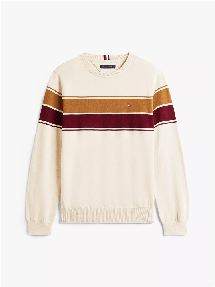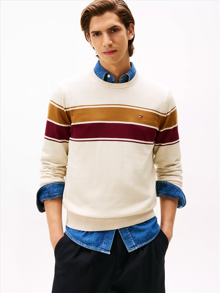 Tommy Hilfiger men's sweater. Made from soft cotton in a smooth jersey stitch, our crewneck is the perfect transitional-weather layer. Designed with a rib-knit hem and cuffs, this version is finished with sporty block stipes at the chest.