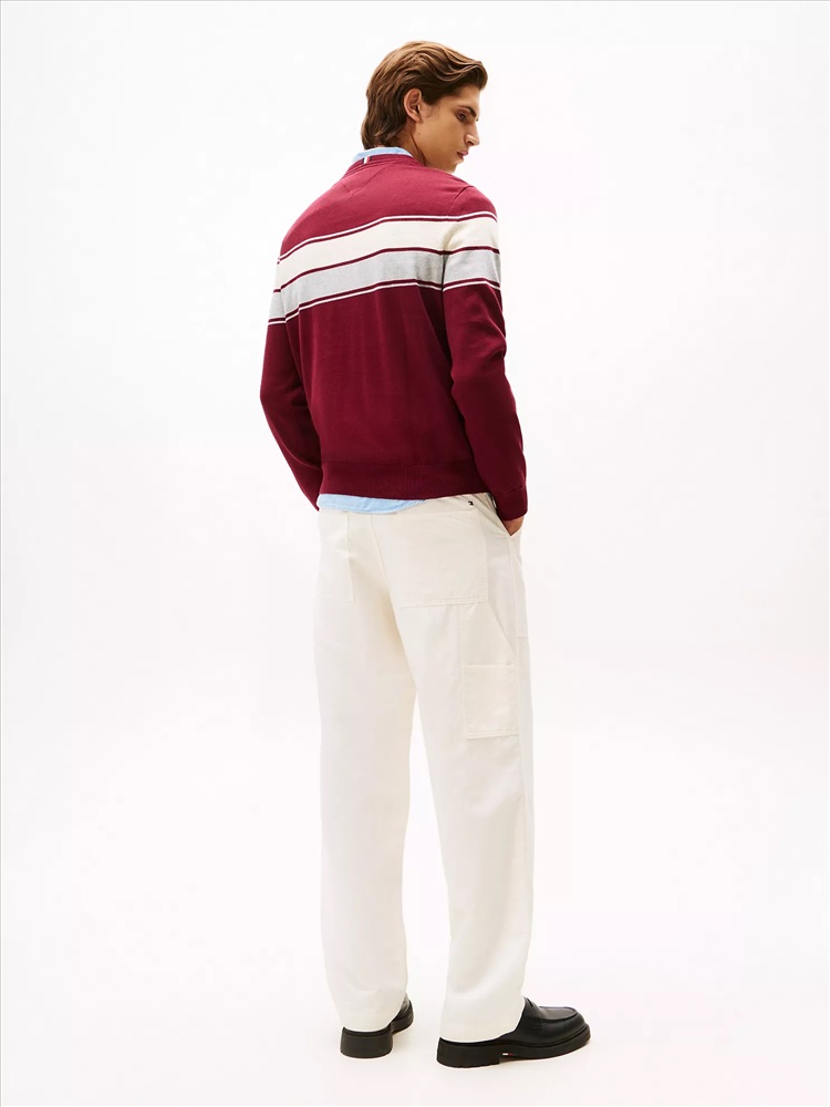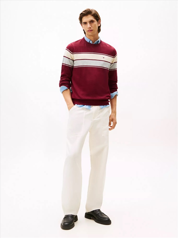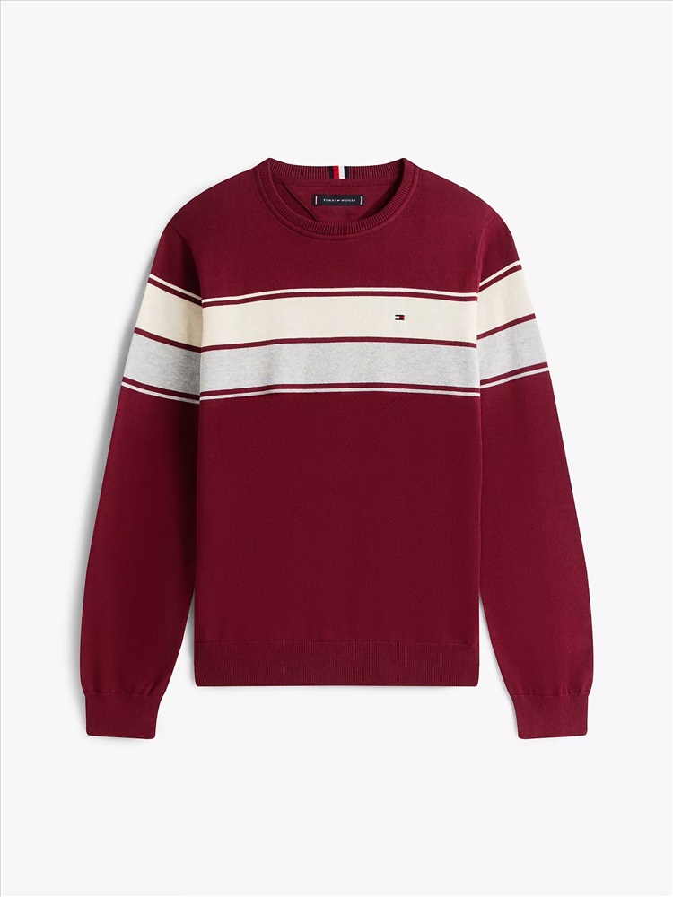 Tommy Hilfiger men's sweater. Made from soft cotton in a smooth jersey stitch, our crewneck is the perfect transitional-weather layer. Designed with a rib-knit hem and cuffs, this version is finished with sporty block stipes at the chest.