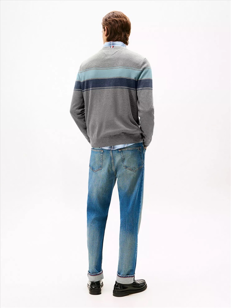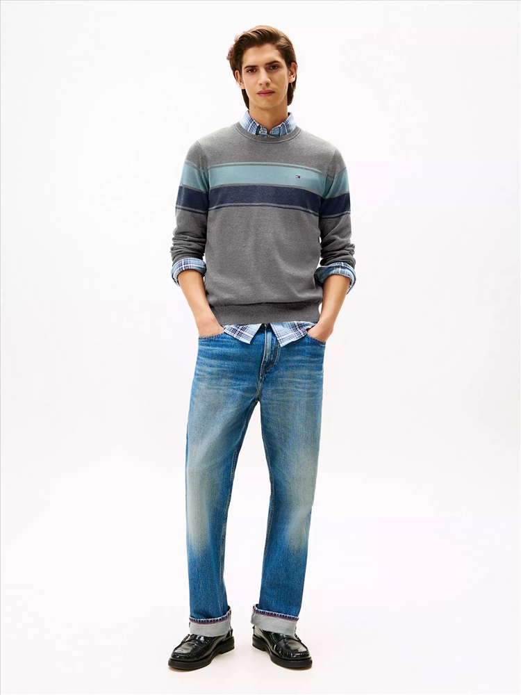 Tommy Hilfiger men's sweater. Made from soft cotton in a smooth jersey stitch, our crewneck is the perfect transitional-weather layer. Designed with a rib-knit hem and cuffs, this version is finished with sporty block stipes at the chest.