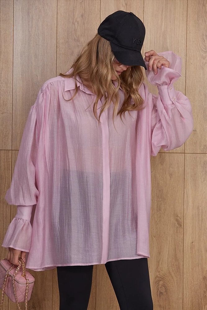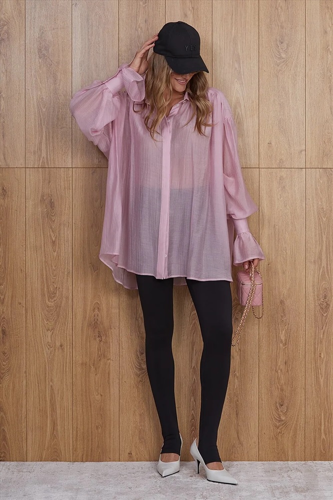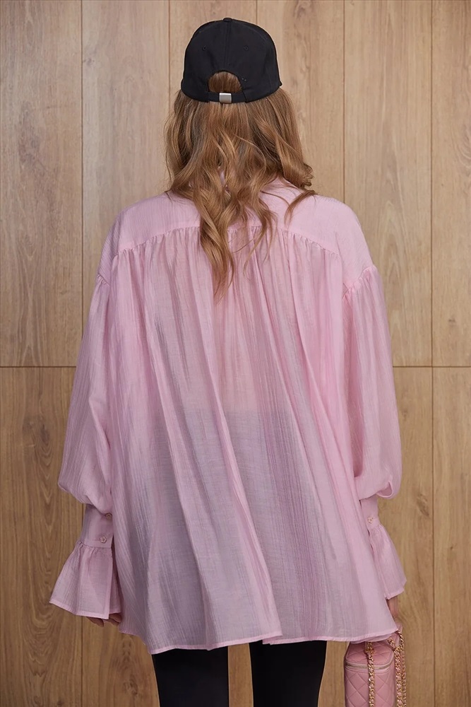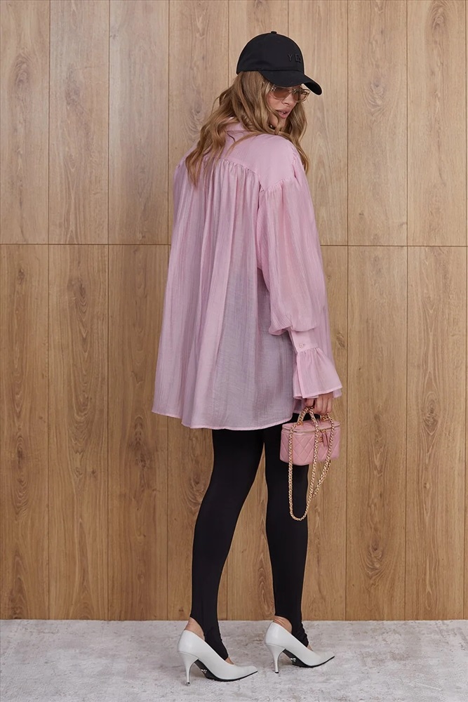 Летящая блуза прямого силуэта, длиной ниже линии бедра. Центральная застежка на плану (супатная застежка). Перед и спинка прямые. По переду кокетка, переходящая на спинку. Спущенная линия плеча. Перед и спинка собраны на сборку. Рукава объемные. Низ рукава на манжете. Воротник рубашечный. Длина изделия 81 см Комментарии к товару