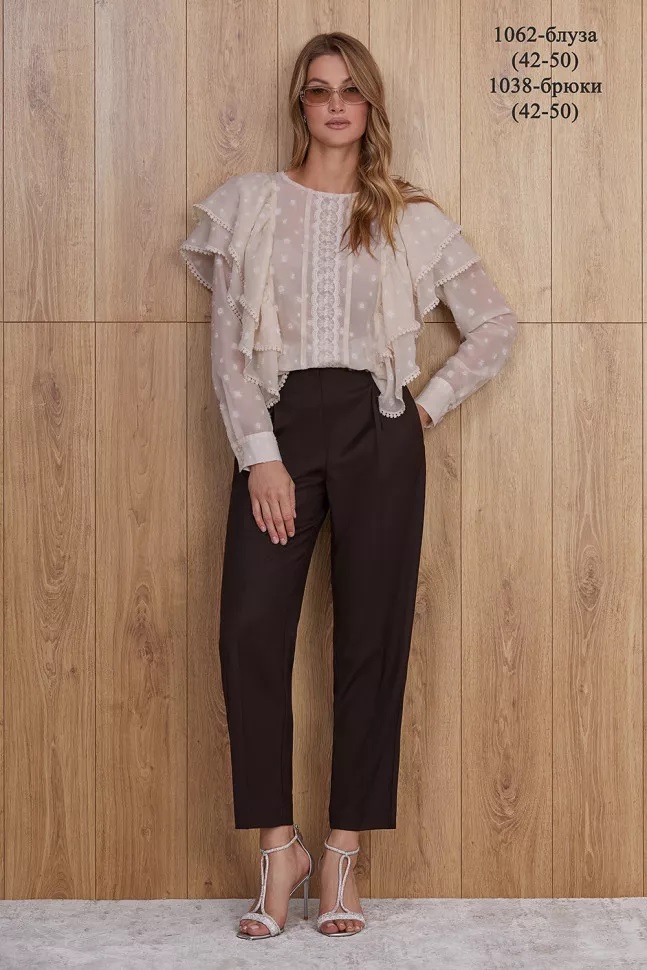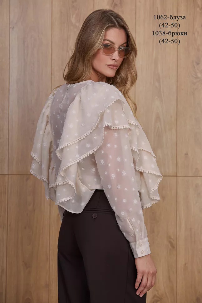 Изящная блуза прямого силуэта. Перед и спинка изделия прямые. По переду и по спинке блузы вертикальные подрезы, в которые вставлены воланы. Горловина круглая. По центру блузы настрочено декоративное кружево. Рукав втачной, рубашечный. Низ рукава на притачной манжете. Спинка прямая, без среднего шва. По спинке разрез и декоративная пуговица. Комментарии к товару