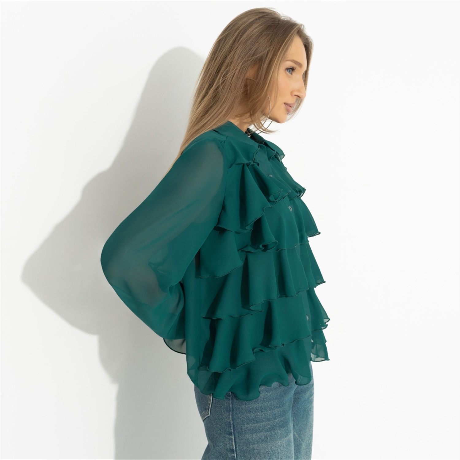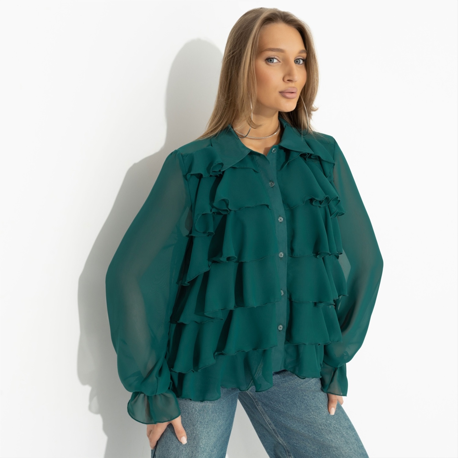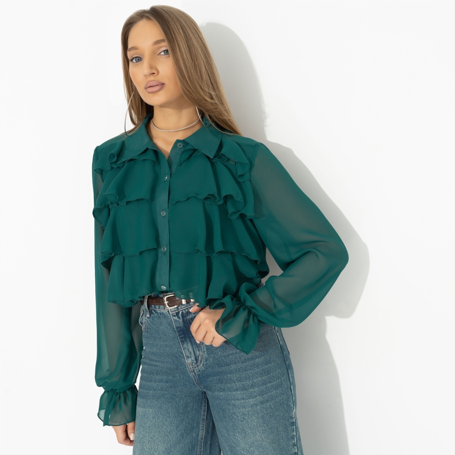 «Гипнотический стиль» – это не просто женская блуза, это воплощение утончённой элегантности и дерзкого стиля. Изумрудный цвет, напоминающий о глубине лесного озера, в сочетании с воздушным шифоном создаёт уникальный образ для тех, кто не боится выделяться из толпы. Эта блуза женская с длинным рукавом станет неотъемлемой частью вашего гардероба, будь то летний вечер или торжественное мероприятие. Если вы цените комфорт и универсальность, то покупка этой блузы оптом станет отличным решением для вашего бизнеса, гарантируя покупателям возможность выразить свою индивидуальность через одежду. Почему именно эта женская блузка с воланами должна стать частью вашего ассортимента? Воланы на передней части добавляют изделию игривости и лёгкости, создавая динамику в образе. Блуза женская нарядная вечерняя подходит для любого случая – от свидания до вечеринки с друзьями. Её свободный силуэт и рукава на резинке обеспечивают комфорт и свободу движений, а лёгкая, слегка просвечивающая ткань добавляет загадочности и романтичности. Если вы хотите привлечь внимание клиентов к своему магазину, закупка этой блузы оптом станет вашим ключом к успеху. Блузка женская больших размеров «Гипнотический стиль» – это универсальное решение для женщин, которые ценят не только стиль, но и удобство. Она прекрасно смотрится как навыпуск, так и в заправленном виде, позволяя создавать разнообразные образы. Этот предмет одежды станет хитом сезона благодаря своей способности адаптироваться к разным стилям и настроениям. Закупая данную блузу женскую оптом, вы предоставите своим клиентам возможность приобретать продукт, который отвечает самым высоким стандартам моды и качества, подчеркивая их уникальность и изысканность. Комментарии к товару