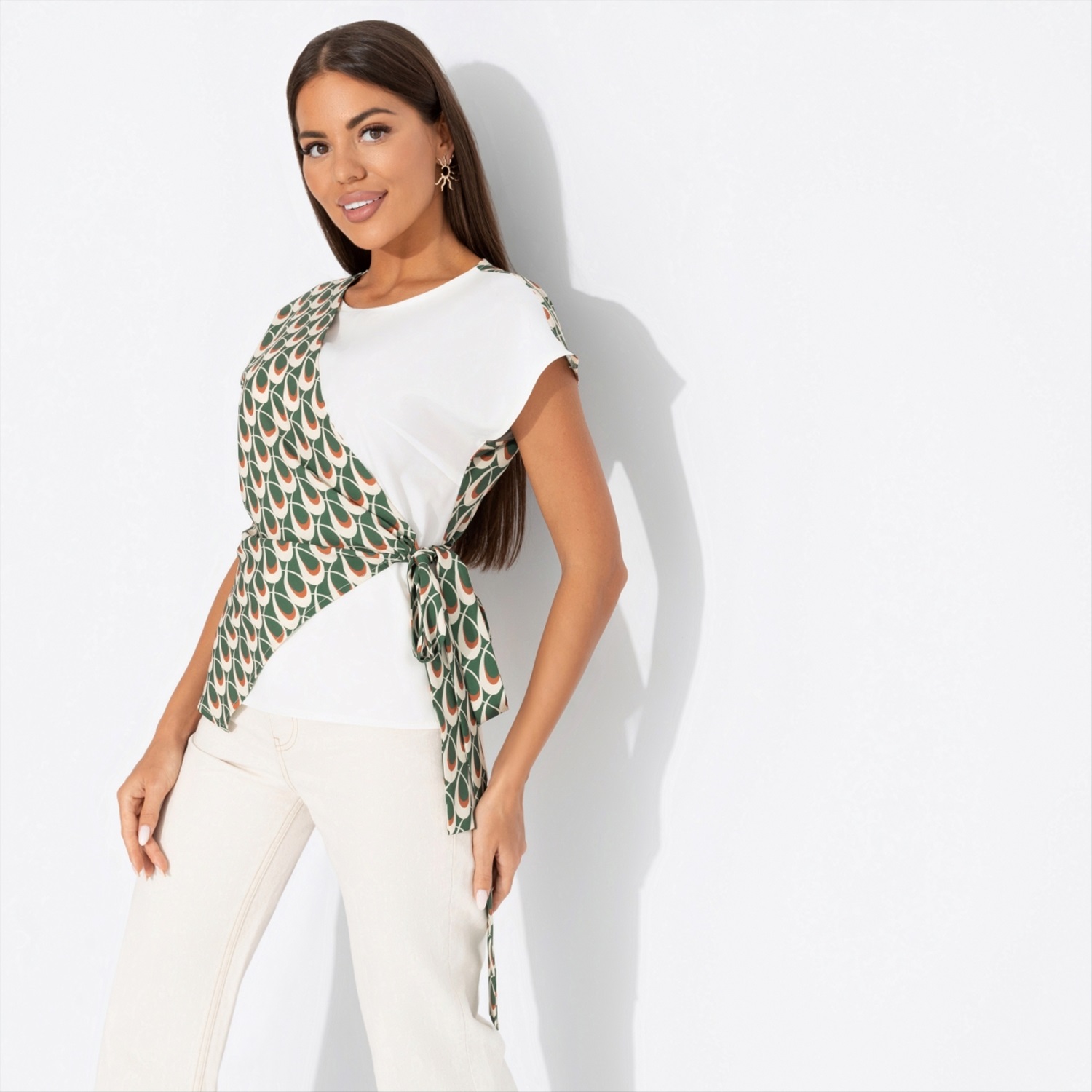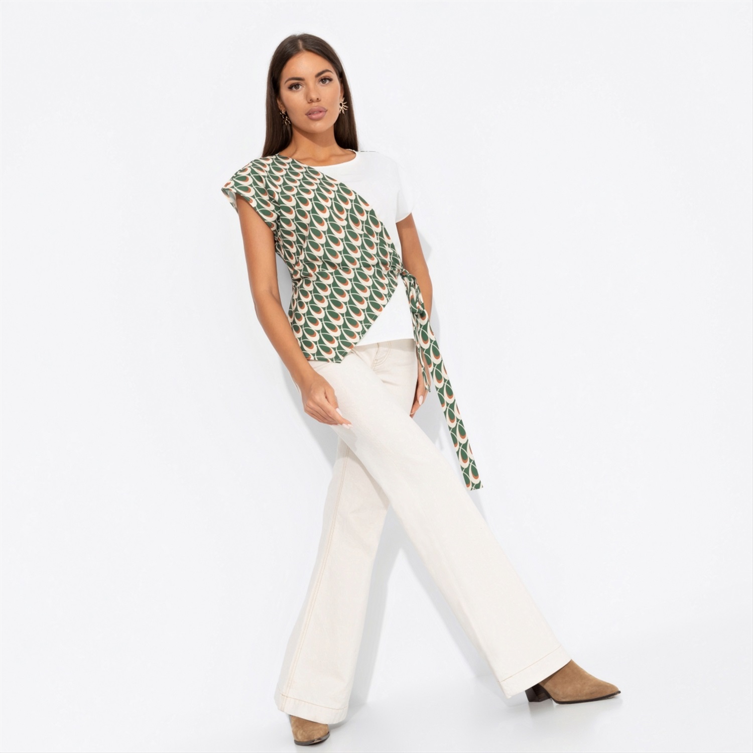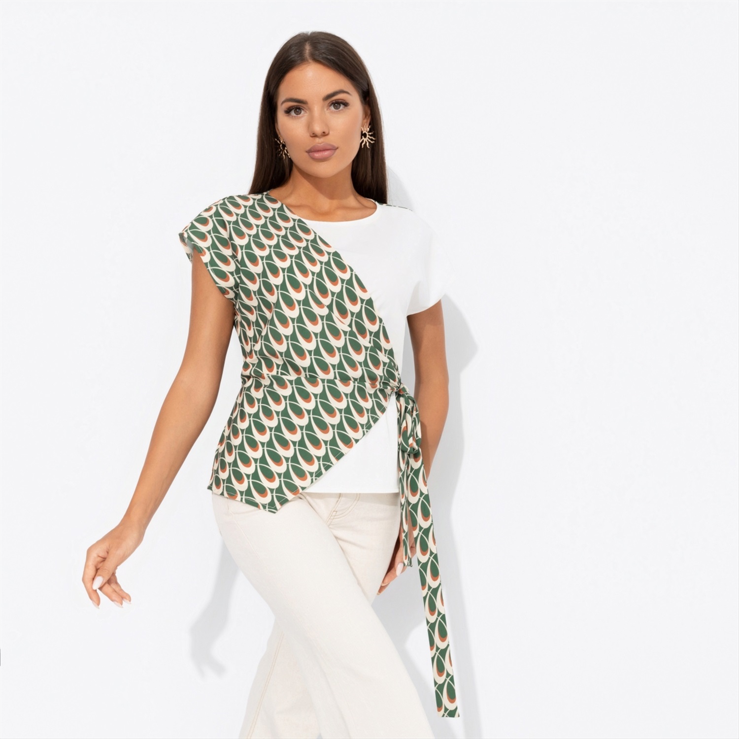 Состав: Ниагара (95% п/а, 5% эластан) Плотность ткани: Средняя Тип ткани: Текстиль Вид застежки: Завязки Декоративные элементы: Завязки Дополнительный цвет ткани: Белый Карманы: Нет Основной цвет ткани: Разноцветный Отрезная талия: Есть Подклад: Нет Резинка по талии: Есть Рисунок/раппорт: Каждое изделие уникально из-за расположения рисунка на ткани Сезон: Лето Силуэт: Приталенный Стиль: Повседневный Параметры модели на фото:
