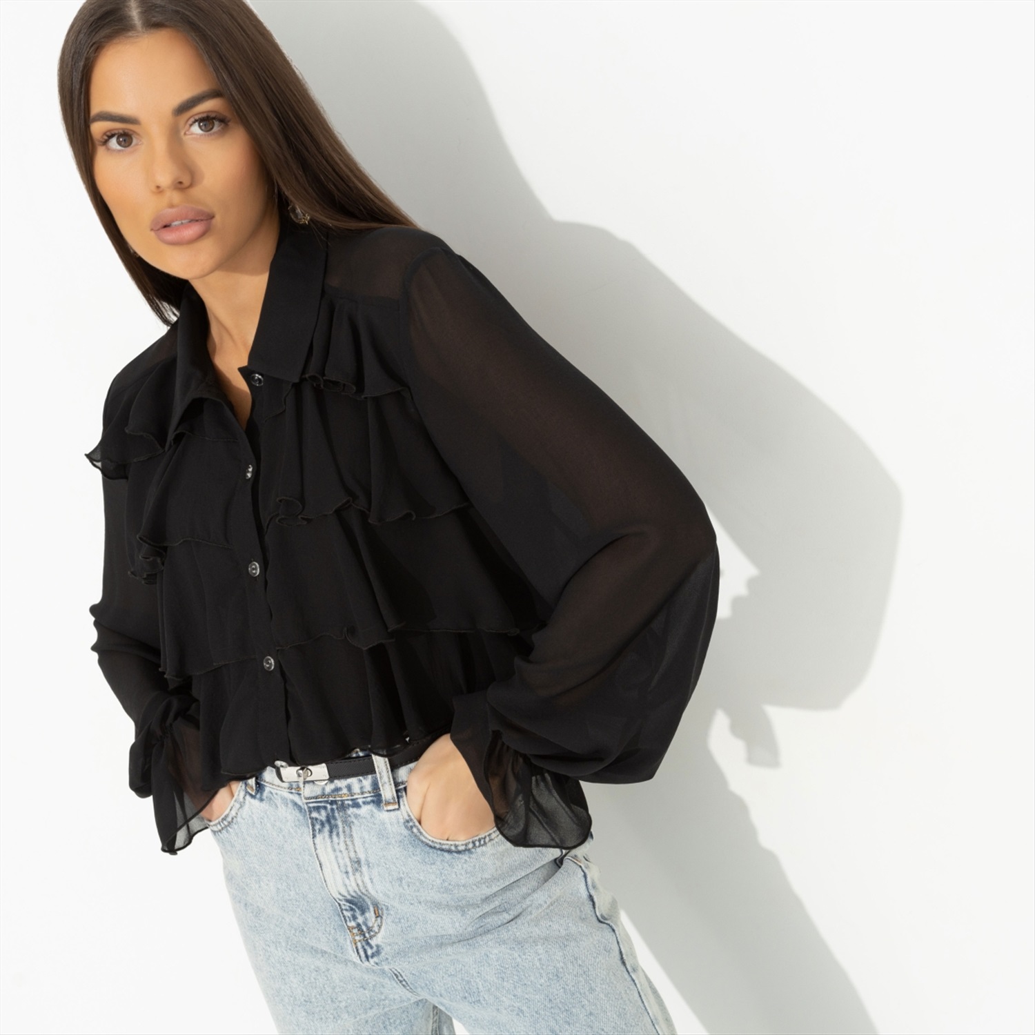 Состав: «Шифон» (100% полиэстер) Плотность ткани: Тонкая Тип ткани: Текстиль Вид застежки: Пуговица/-ы Карманы: Нет Основной цвет ткани: Черный Отрезная талия: Нет Подклад: Нет Резинка по талии: Нет Рисунок/раппорт: Нет, все изделия идентичны Сезон: Круглогодичный Силуэт: Свободный Стиль: Деловой Параметры модели на фото: