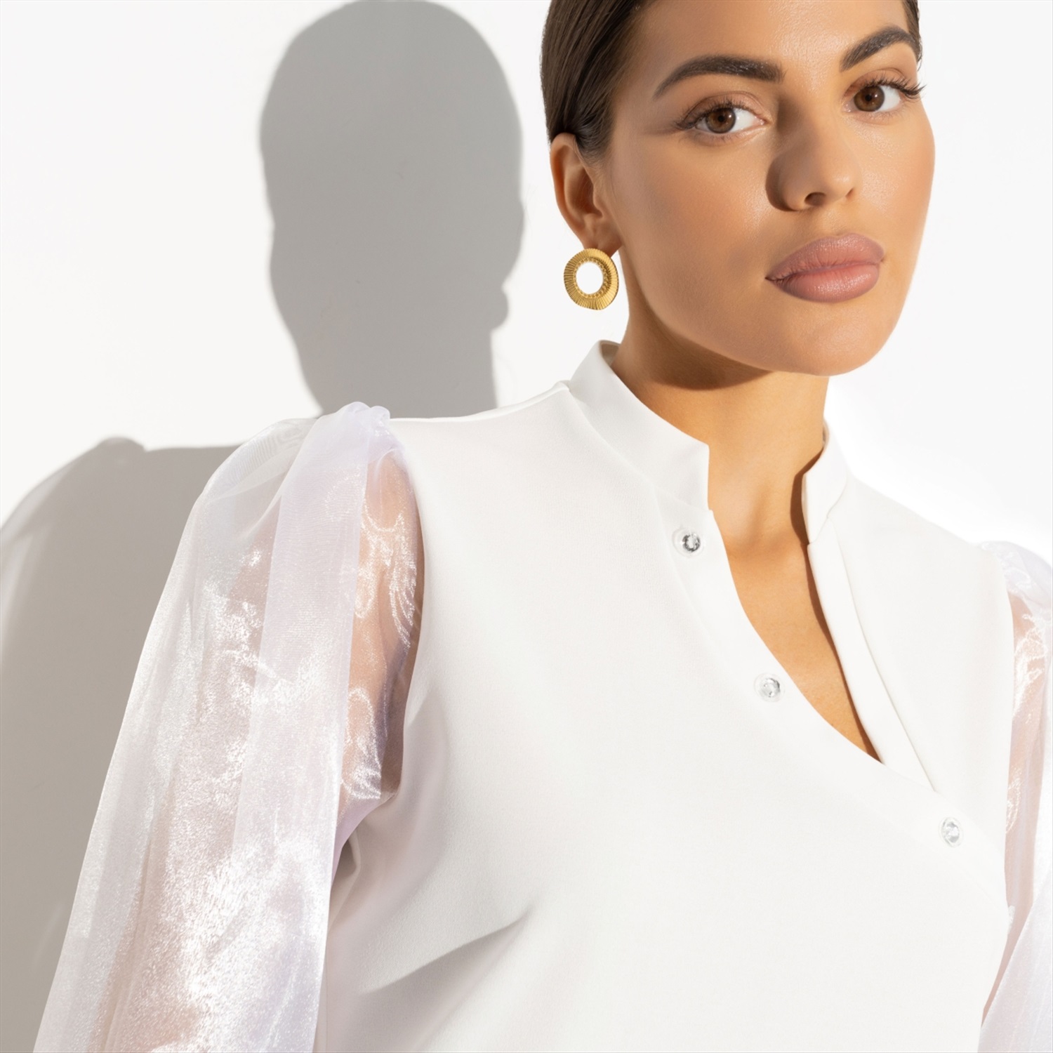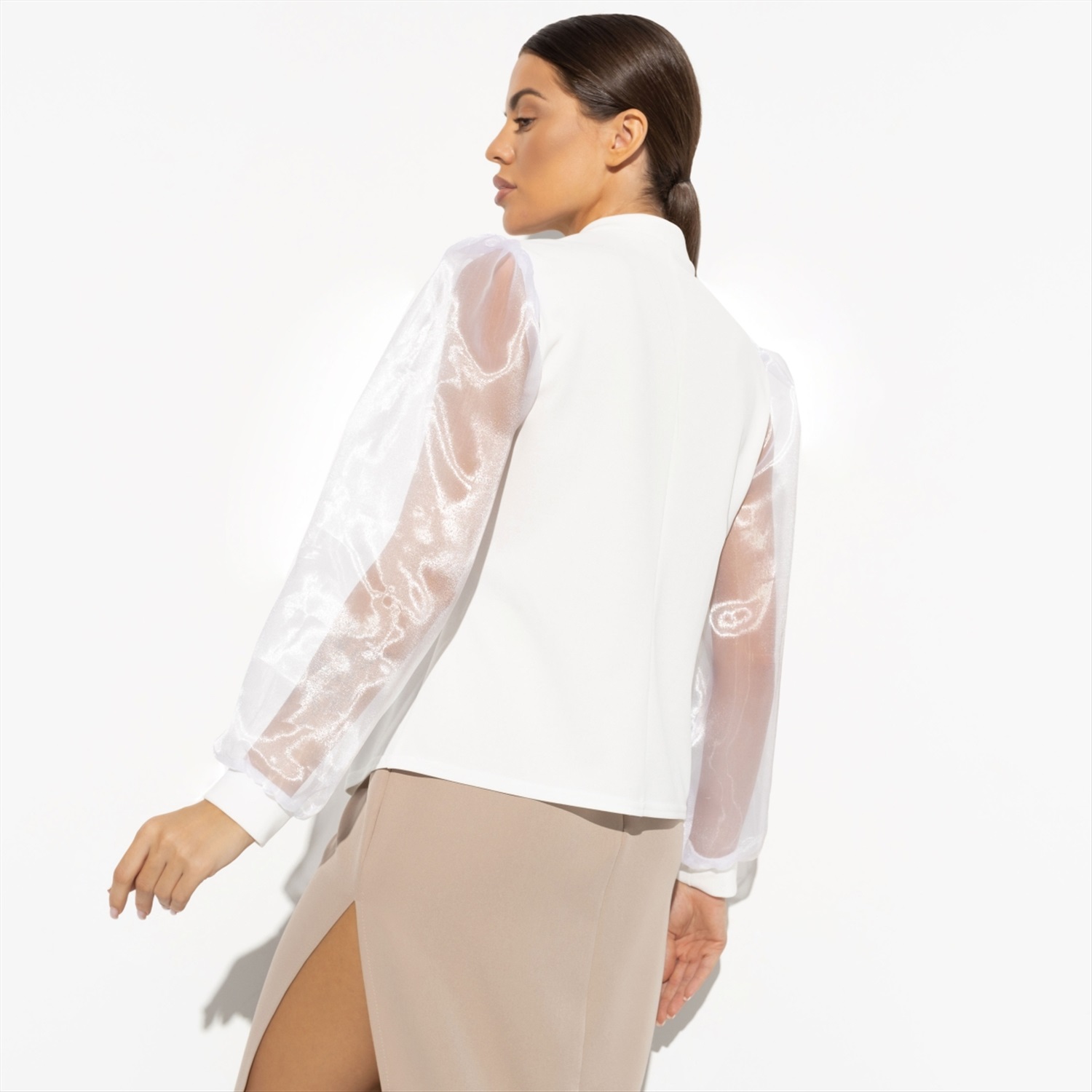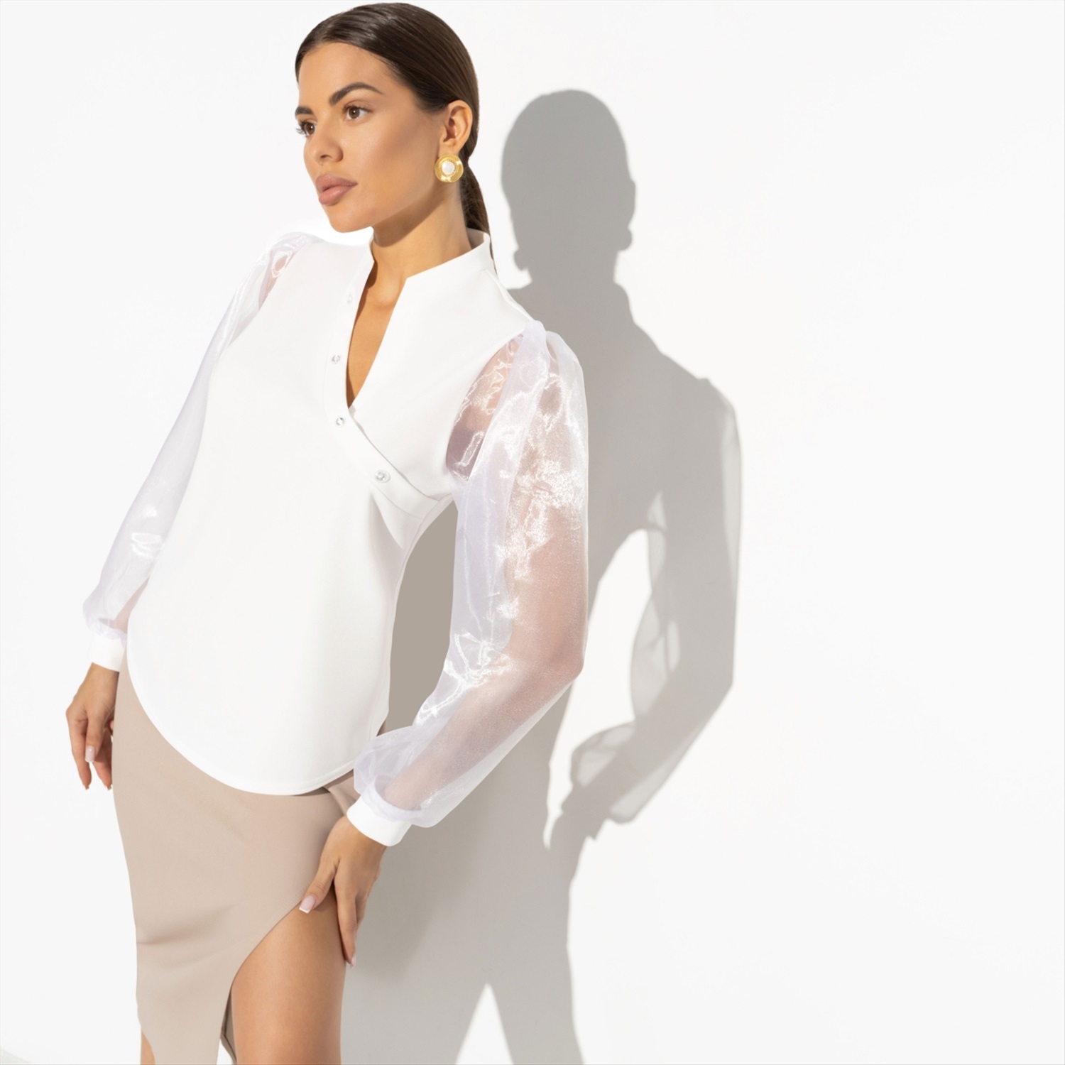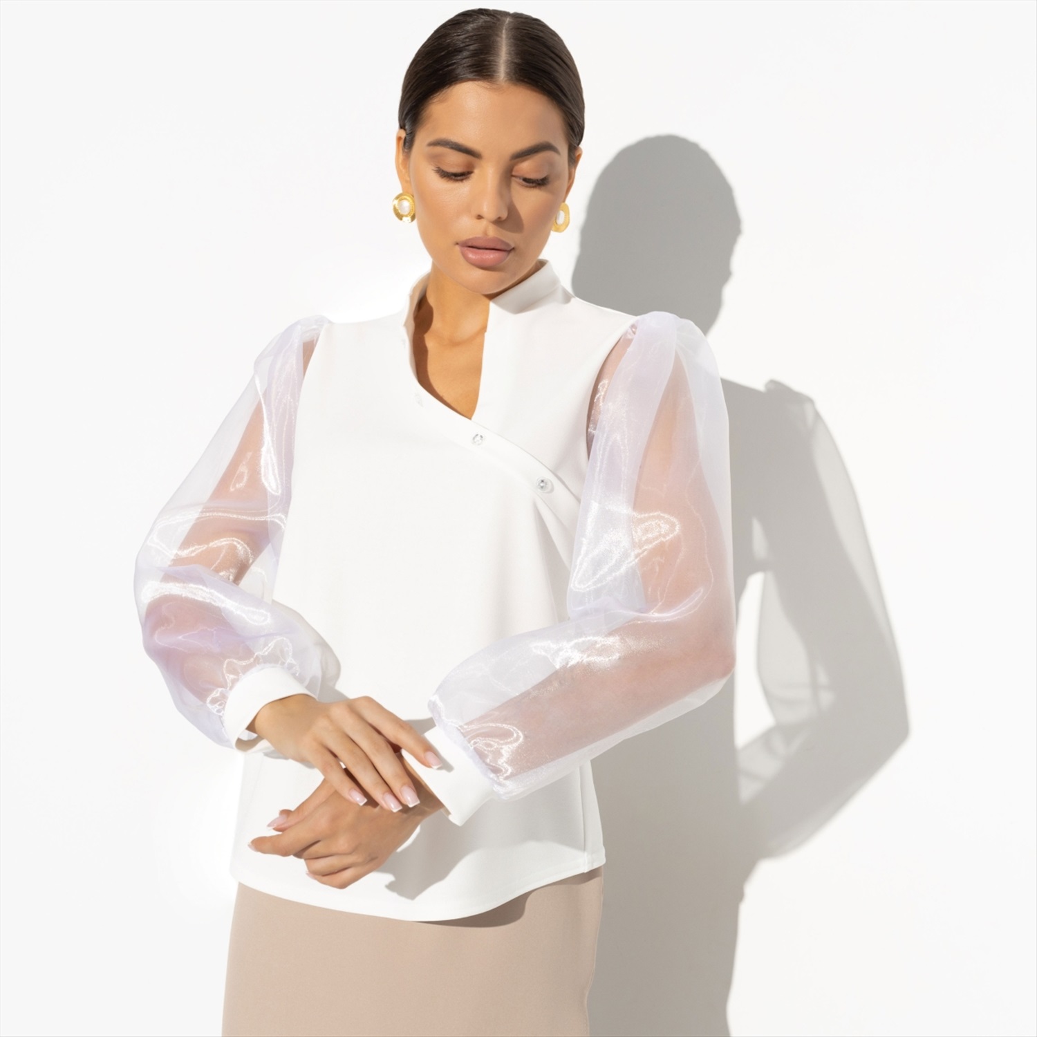 Состав: Трикотаж «скуба», органза (95% п/а, 5% эластан) Плотность ткани: Средняя Тип ткани: Трикотаж, текстиль Вид застежки: Нет Карманы: Нет Основной цвет ткани: Белый Отрезная талия: Нет Подклад: Нет Резинка по талии: Нет Рисунок/раппорт: Нет, все изделия идентичны Сезон: Круглогодичный Силуэт: Свободный Стиль: Деловой Параметры модели на фото: