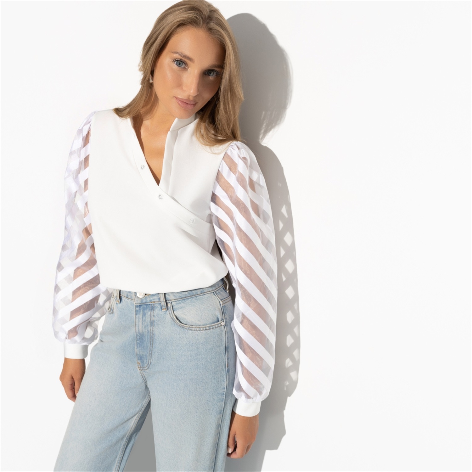 Состав: Трикотаж «скуба», органза (95% п/а, 5% эластан) Плотность ткани: Средняя Тип ткани: Трикотаж, текстиль Вид застежки: Нет Карманы: Нет Основной цвет ткани: Белый Отрезная талия: Нет Подклад: Нет Резинка по талии: Нет Рисунок/раппорт: Нет, все изделия идентичны Сезон: Круглогодичный Эта блуза «Волшебное очарование (pearl)» — воплощение грандиозного сочетания изысканности и строгости, идеально подходящего для самых взыскательных ценителей моды. Заказав оптом этот чудесный предмет гардероба, вы создадите основу для бесчисленных стильных образов. Прозрачные рукава из органзы подходят как для деловых встреч, где внимание к деталям особенно важно, так и для коктейльных вечеринок, где легкость и изящество важнее всего. Вырез в зоне декольте обрамляет образ чарами, добавляя нотку флирта и загадки. Сделайте первый шаг к созданию модной коллекции, купив эту блузу оптом для своего бутика. Покупая блузу оптом, вы ощутите, как ваша аудитория начинает очаровываться магией. Уникальная ткань трикотаж «скуба» не только обеспечивает комфорт в течение всего дня, но и облегает фигуру, подчеркивая её достоинства. Эта блуза будет отлично смотреться и заправленной в строгие брюки, и свободно спадающей на бедра. Разнообразие возможных сочетаний позволит покупателям создавать образы, которые выделят их из толпы, подчёркивая уникальность и индивидуальность каждого владельца подобной блузы. Ваши клиенты будут благодарны за возможность покупки блузы с прозрачными рукавами как средством самовыражения и тонкого заигрывания. Эта блуза становится символом уверенности и женственности, открывая двери к новым знакомствам и возможностям. Оформите оптовый заказ и предоставьте вашим клиентам шанс выделиться в любой компании, чувствовать себя уверенно и привлекательно в уникальной и стильной вещи, которую не найдёшь ни в одном другом магазине. Комментарии к товару