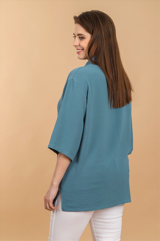 Блуза (рубашка) женская из тканого гладкокрашеного полотна «Лен Манго», свободного покроя, с короткими втачными рукавами, стояче-отложным воротником, центральной бортовой застежкой на обметанные петли и пуговицы. В боковых швах разрезы.