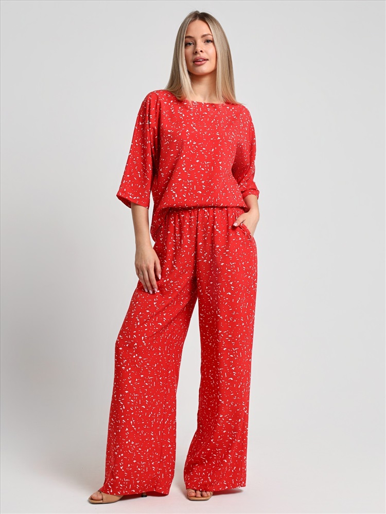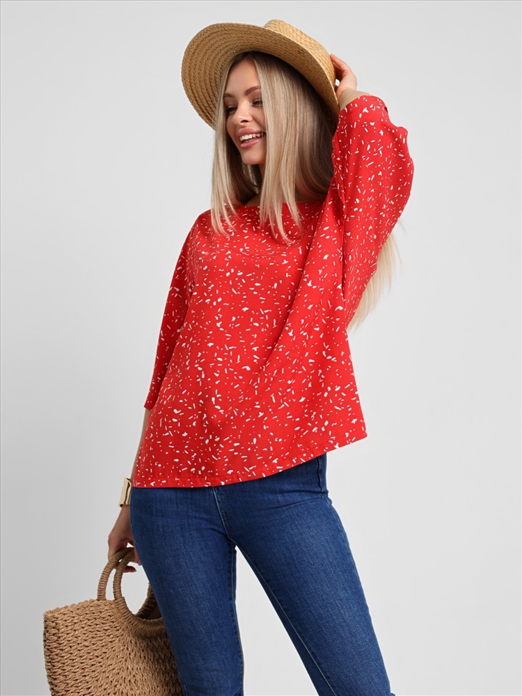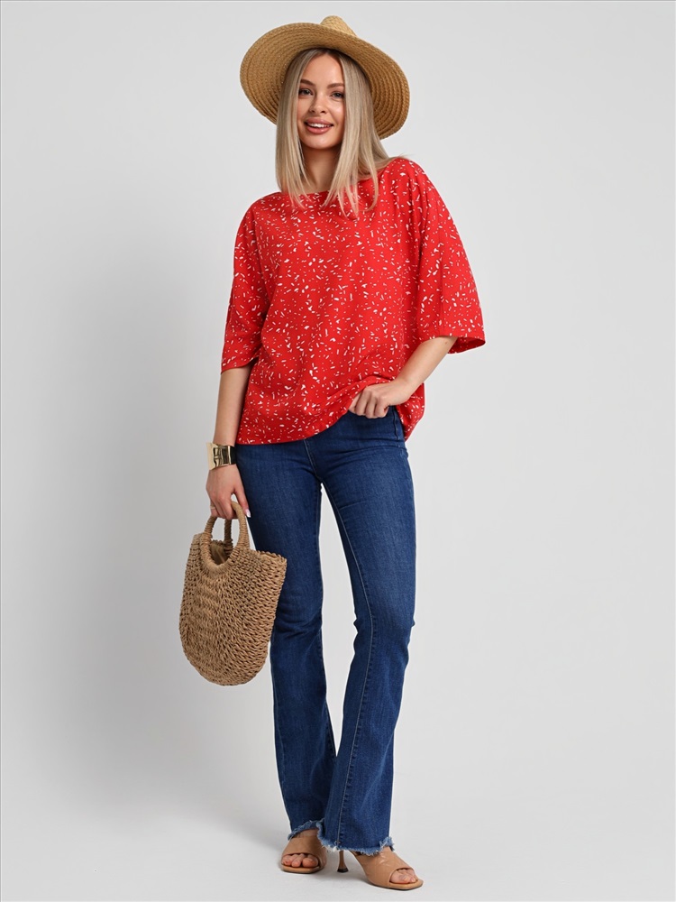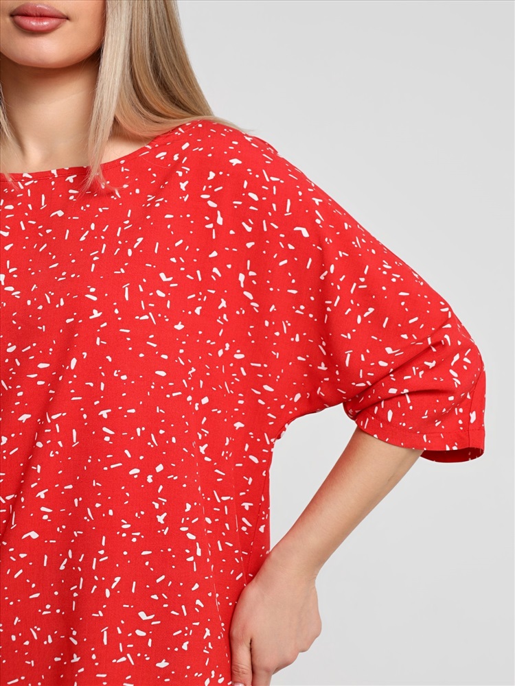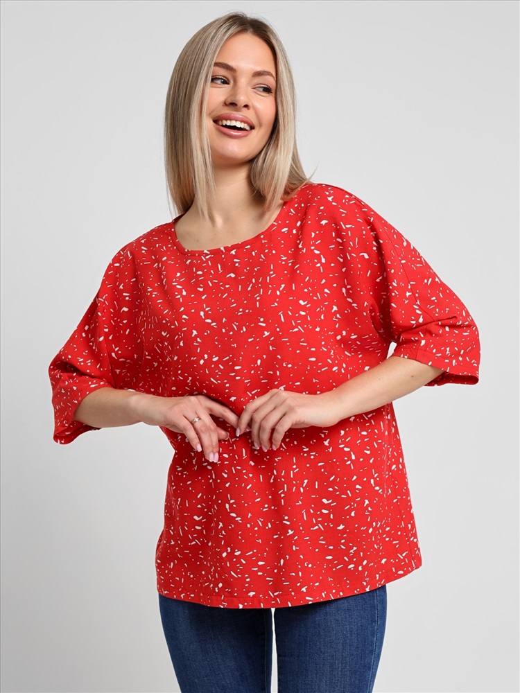 Блуза женская из гладкокрашеного тканого полотна «муслин», прямого силуэта, с горловиной овальной формы и короткими втачными рукавами. Горловина обработана втачной планкой, в боковых швах разрезы.