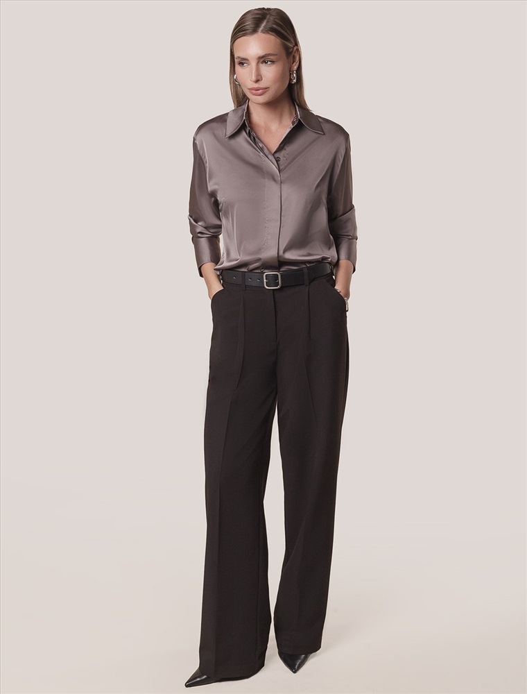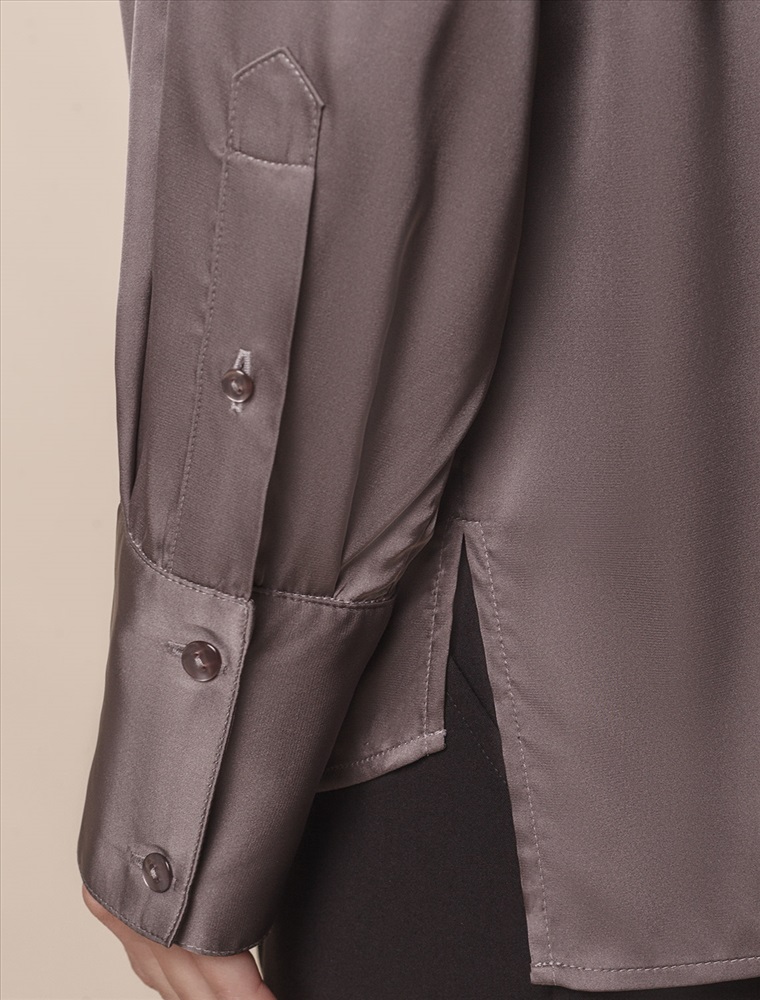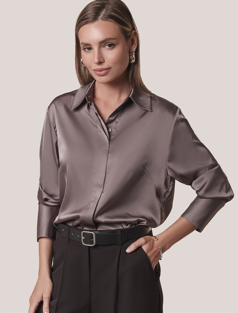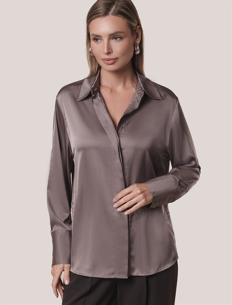 Сатиновая блузка с эластаном кофейного цвета – воплощение элегантности и комфорта. Благородный блеск сатина добавляет образу шика, а эластичность материала гарантирует удобство при носке. Прямой силуэт блузки обеспечивает комфорт, а эластичность материала предотвращает деформацию. Застежка-планка с потайными пуговицами придает модели аккуратность. Универсальный вариант для casual-образов.