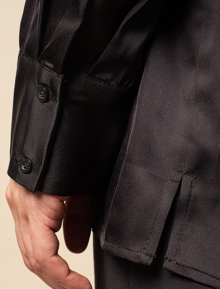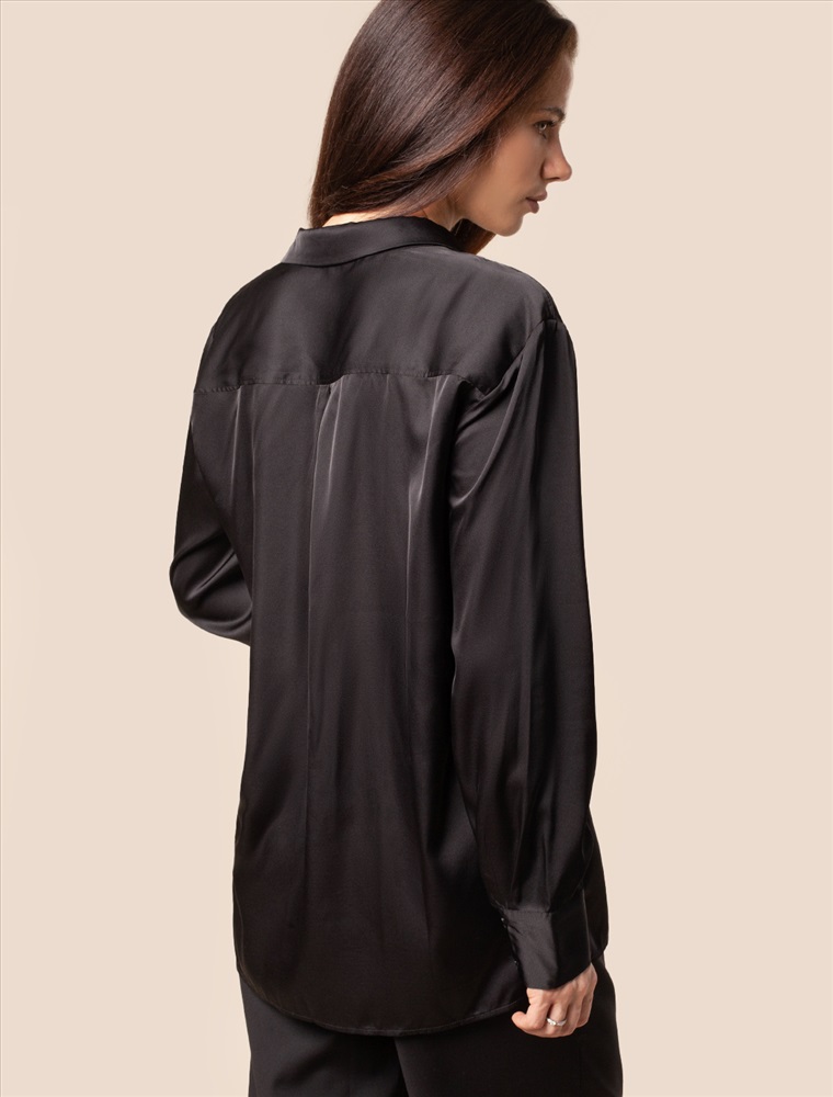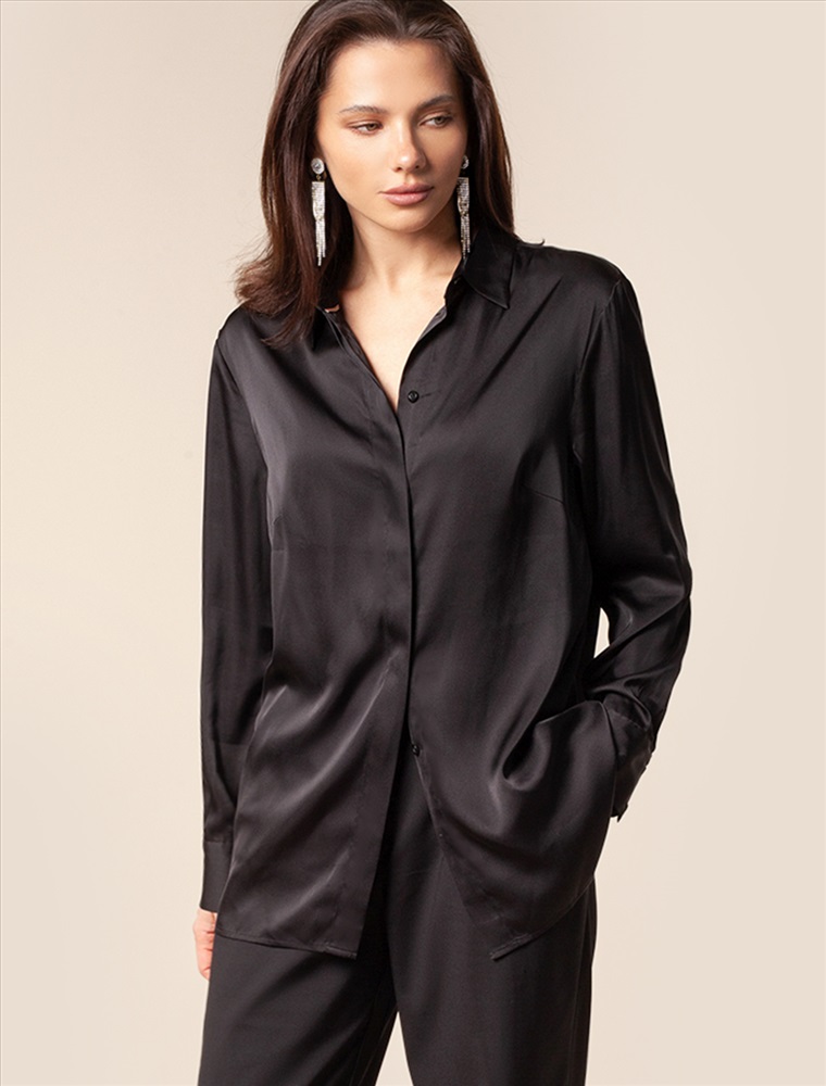 Блузка прямого силуэта выполнена из эластичного струящегося сатина. Невероятно женственная модель в тренде на пижамный стиль, изящно струится и драпируется по фигуре, напоминая натуральный шелк. Лаконичный дизайн поддерживает застежка планка на потайные пуговицы. Сочетайте изделие с жакетами и строгими брюками, внося в образ легкое настроение.