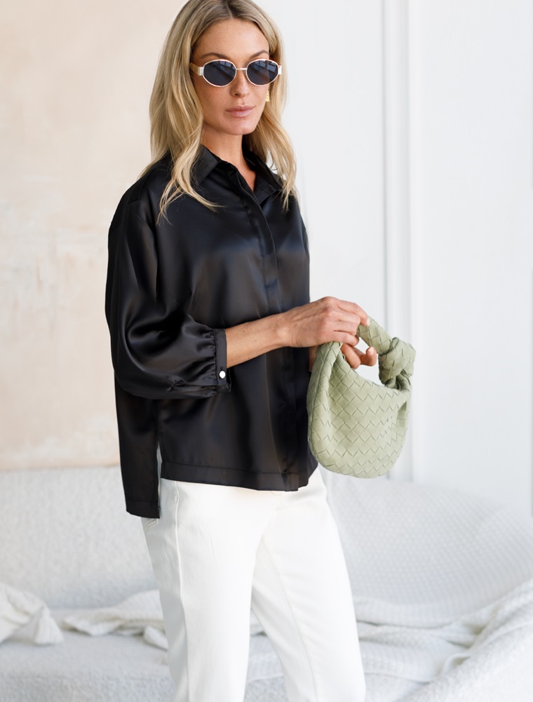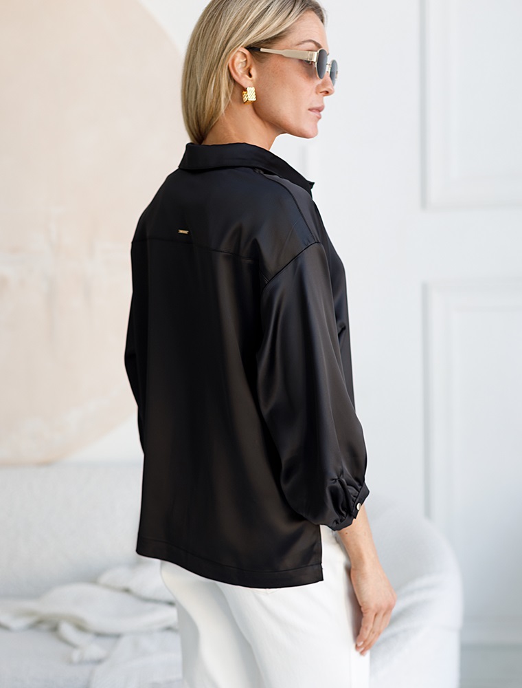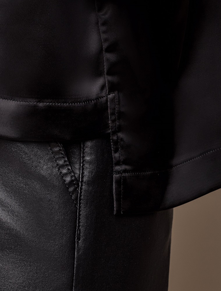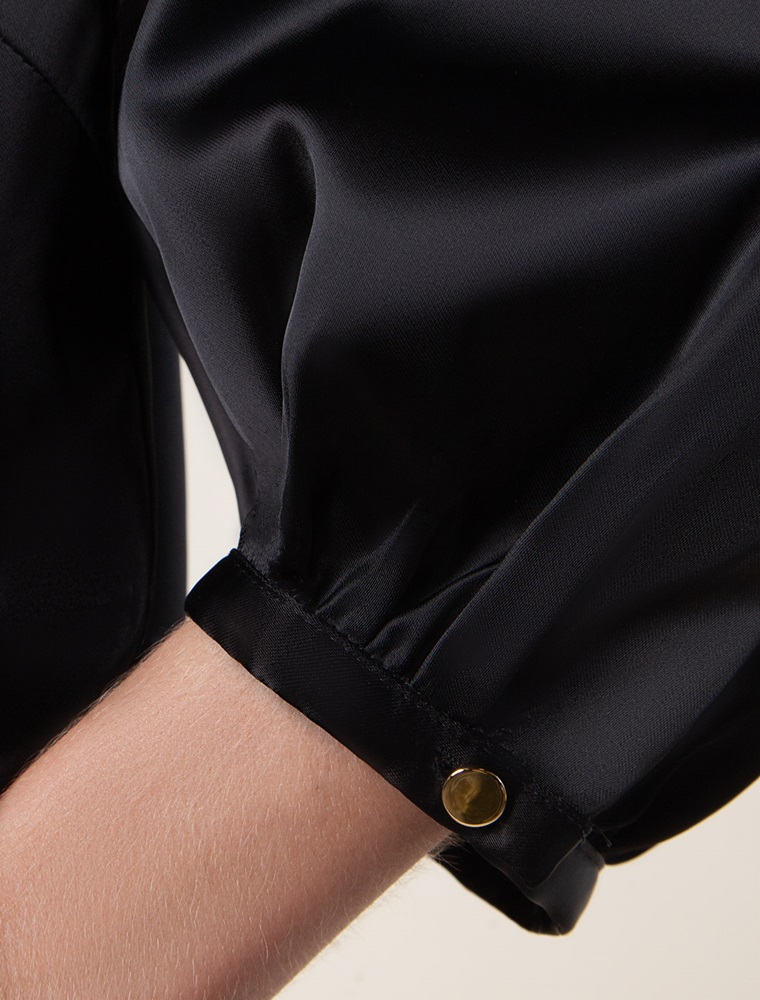 Блузка выполнена из струящегося сатина напоминающий натуральный шелк. Модель с застежкой планкой дополнена золотистыми пуговицами на манжетах и воротнике. Расслабленный силуэт поддерживает спущенная линия плеча и рукава с небольшими фонариками. Спинка изделия чуть длиннее. Сочетайте в костюме с юбкой D26.193 и брюками D24.221 чтобы создать роскошный праздничный образ. В комплекте с джинсами или любым другим низом из гардероба, для повседневного образа.