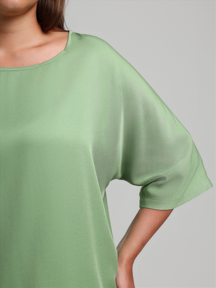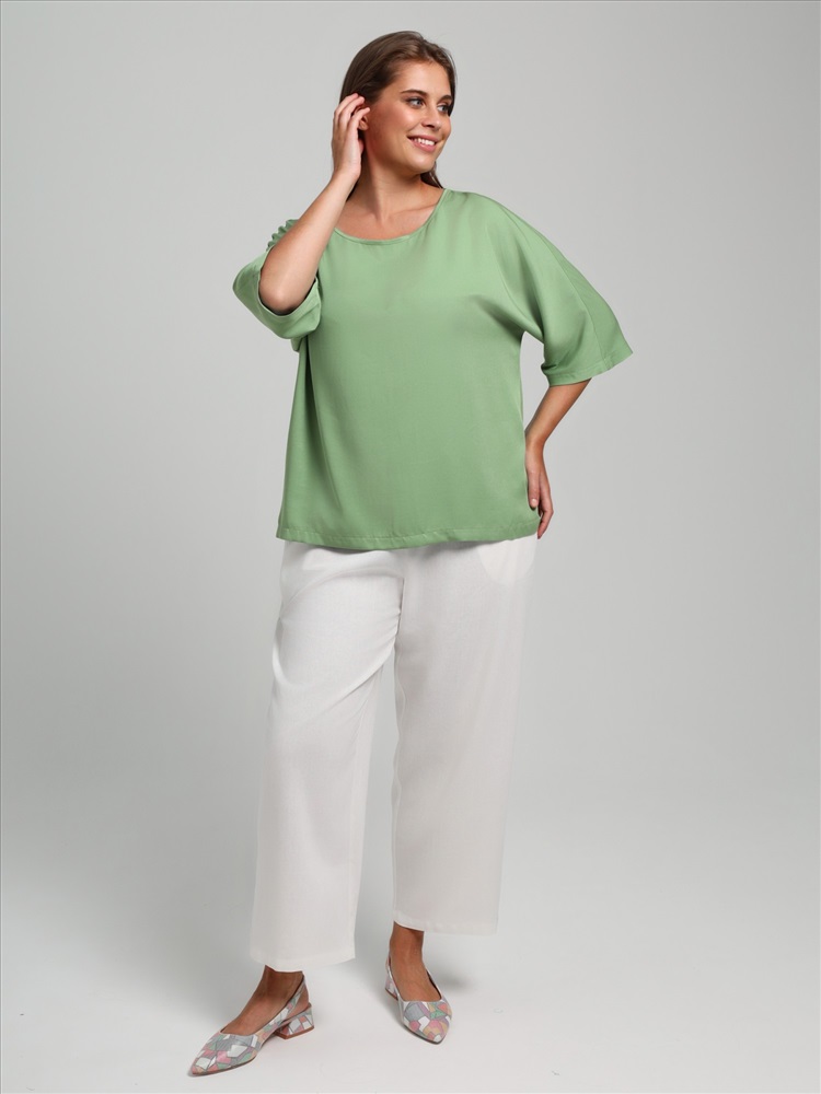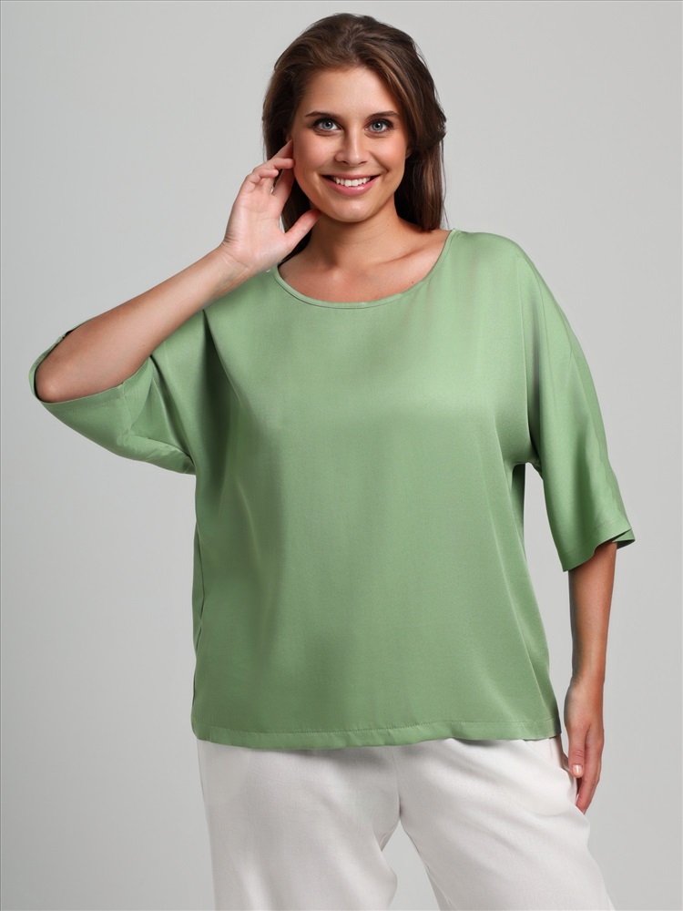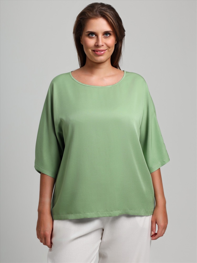 Блуза женская из гладкокрашеного тканого штапельного полотна, свободного кроя с горловиной овальной формы, обработанной окантовкой из основного материала, с цельнокроеными рукавами длиной до локтя.