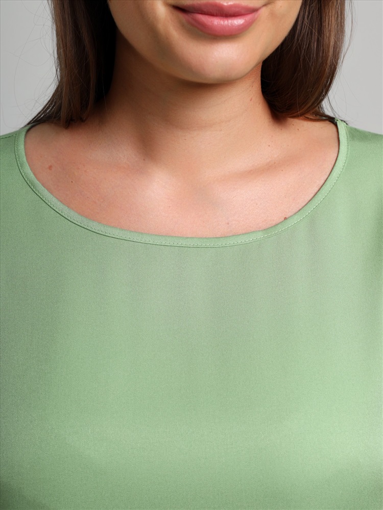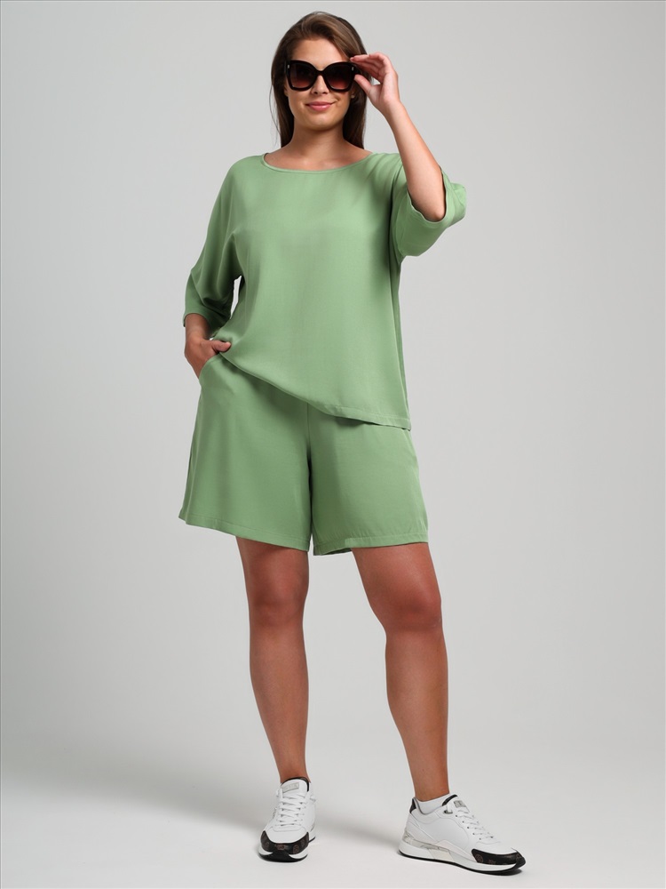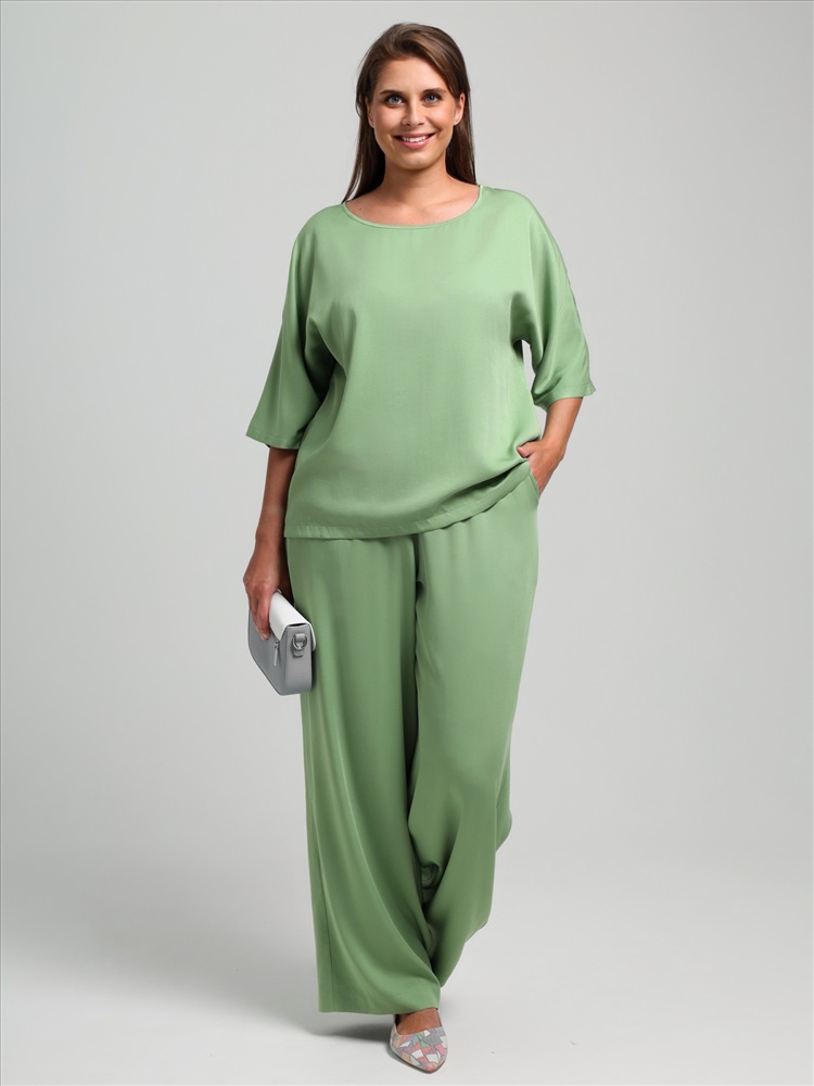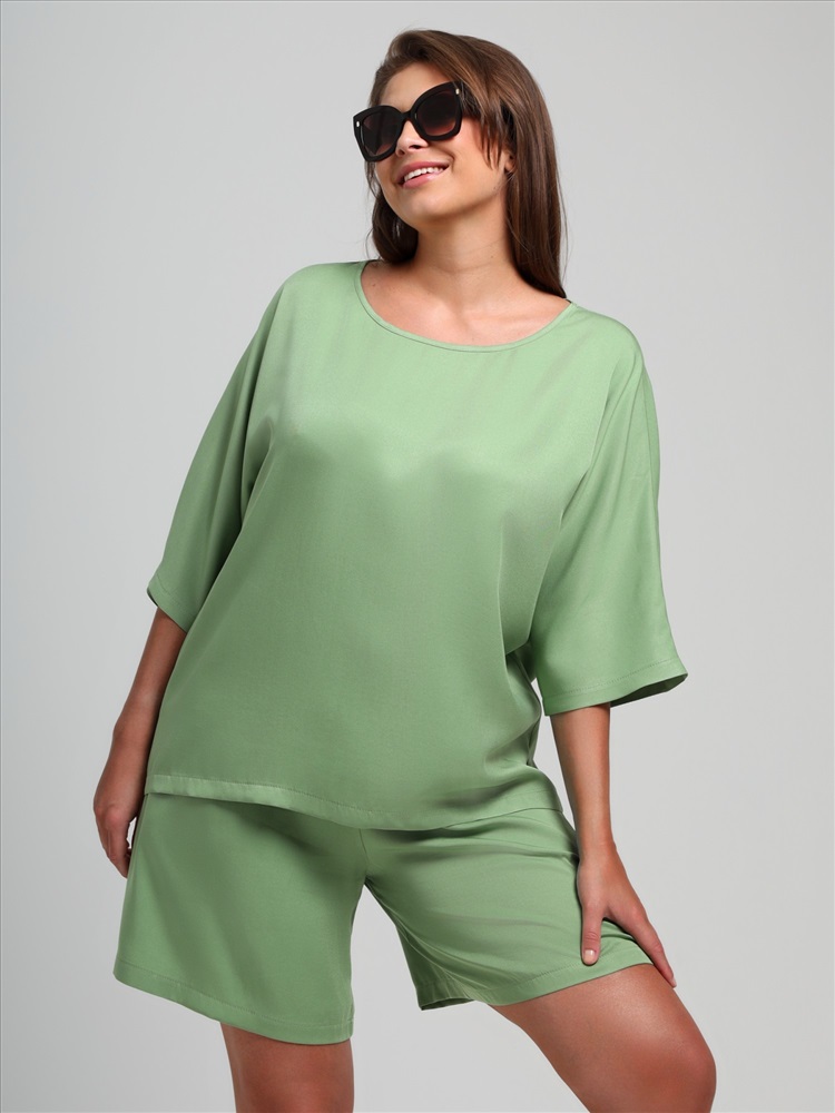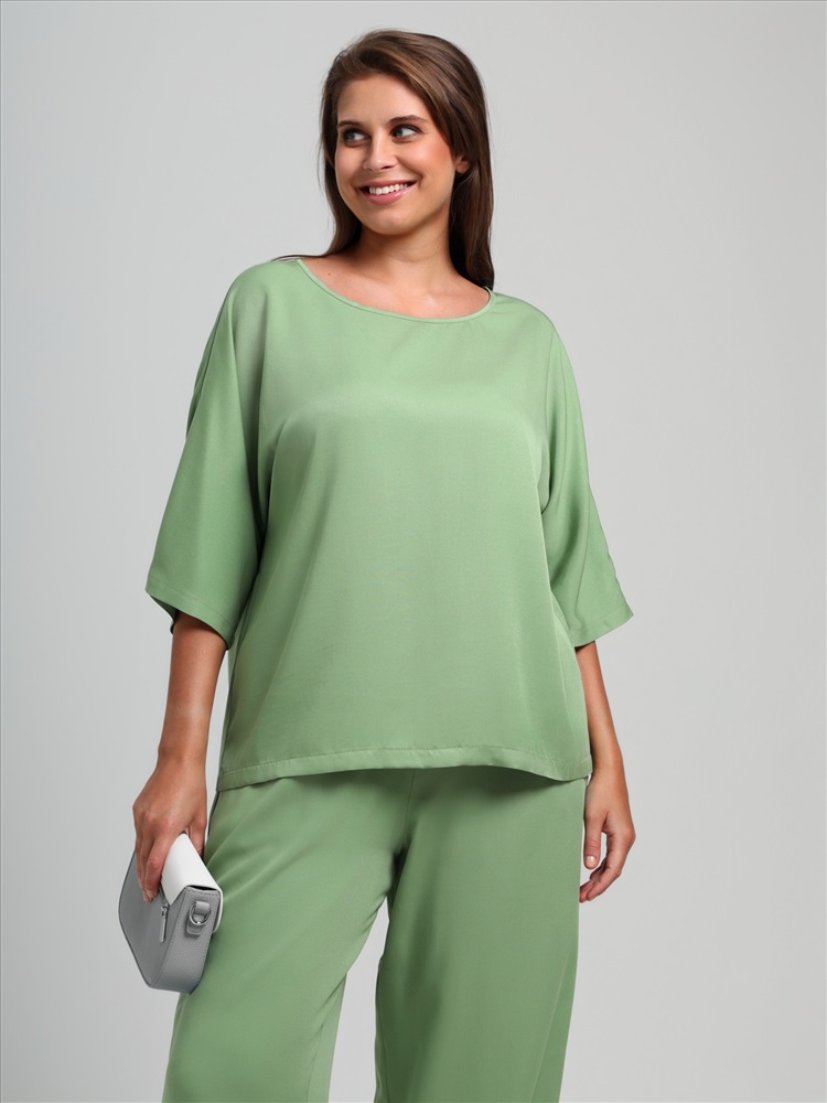 Блуза женская из гладкокрашеного тканого штапельного полотна, свободного кроя с горловиной овальной формы, обработанной окантовкой из основного материала, с цельнокроеными рукавами длиной до локтя.