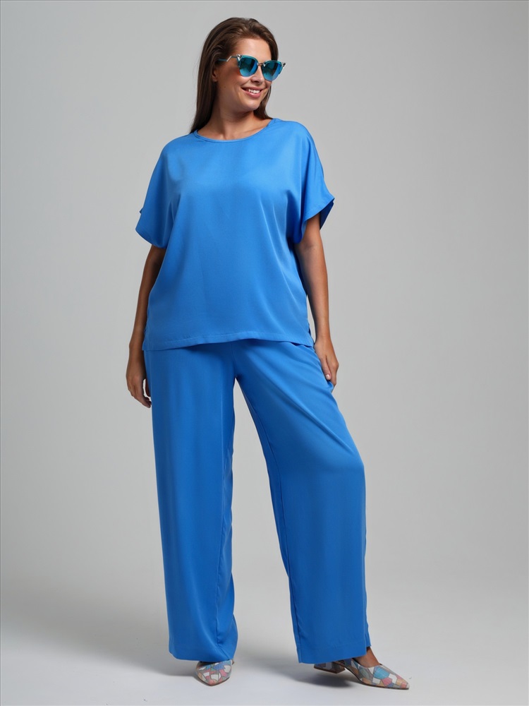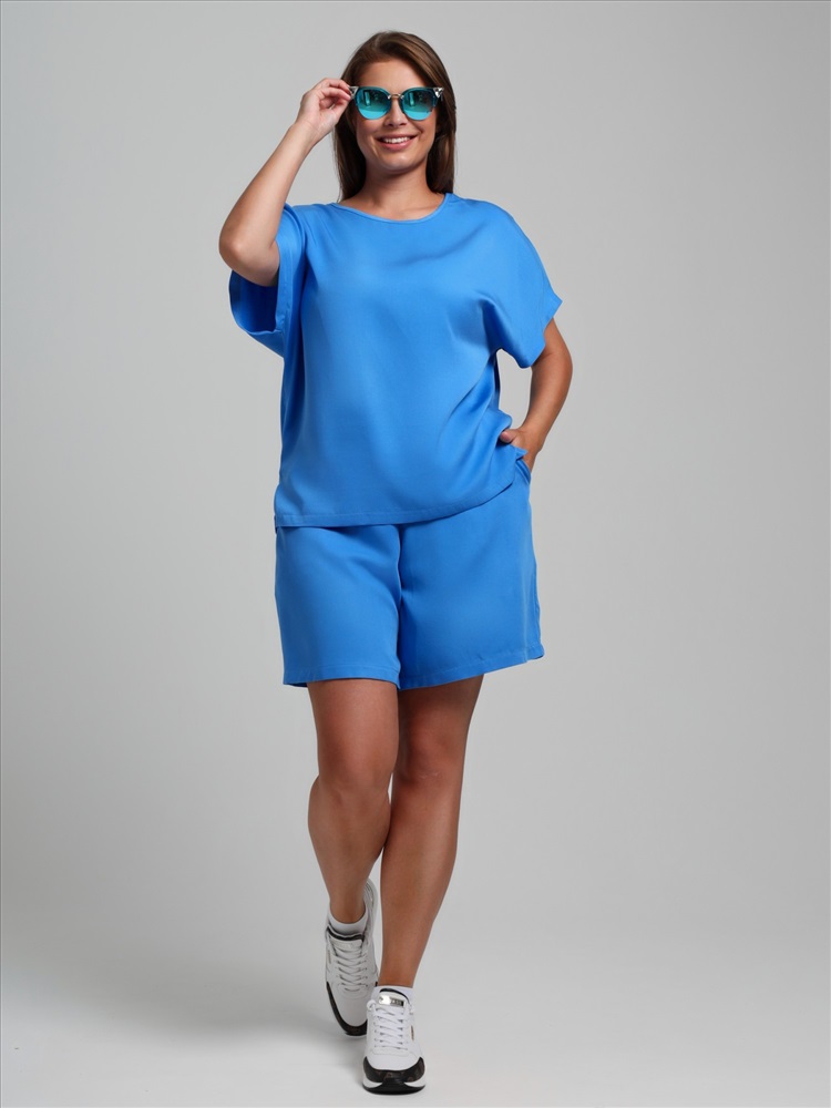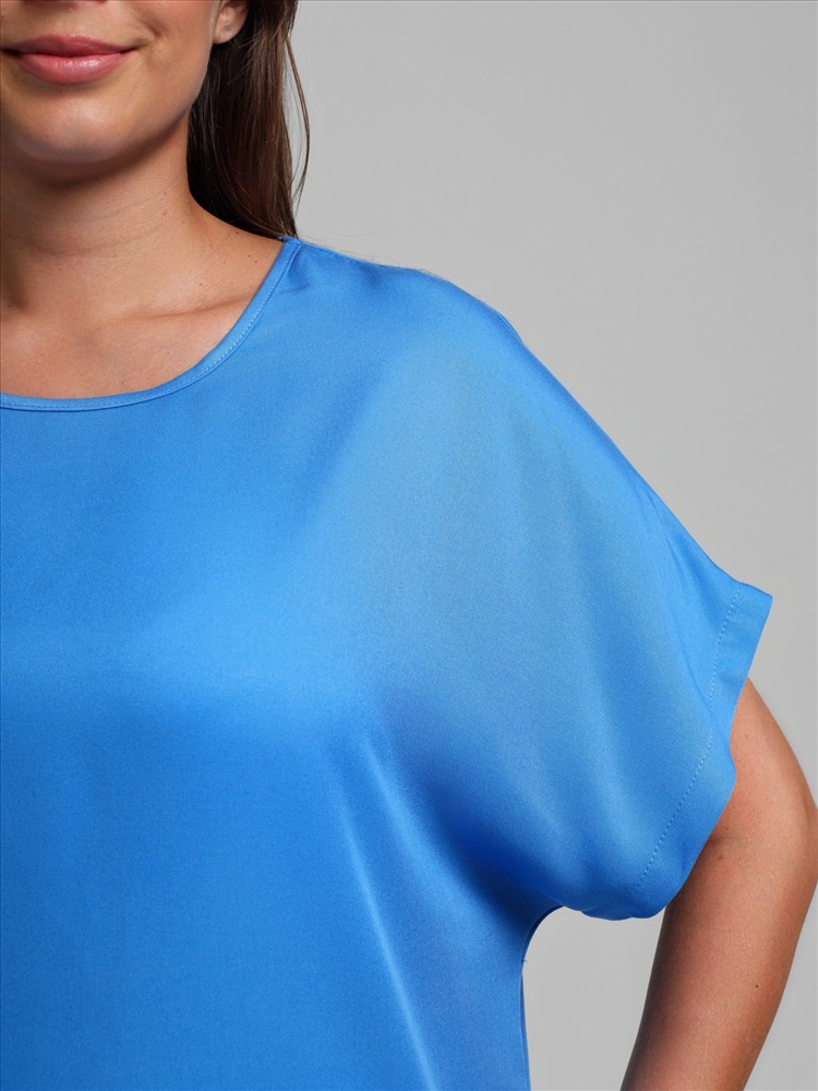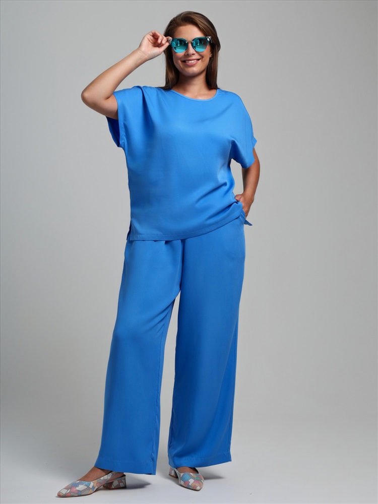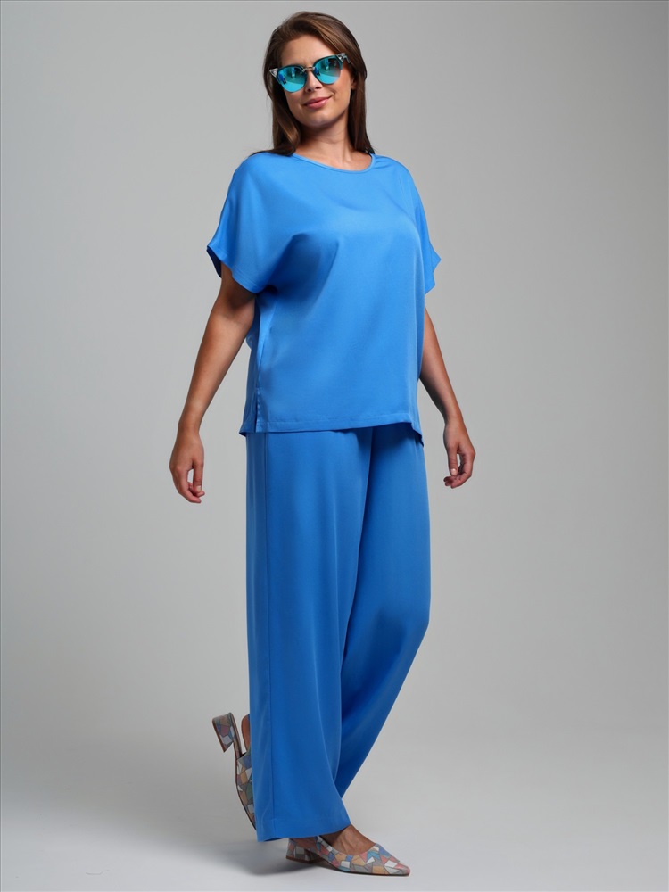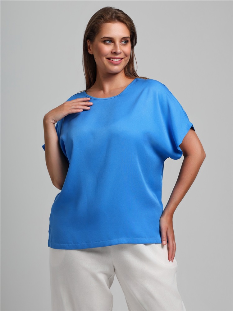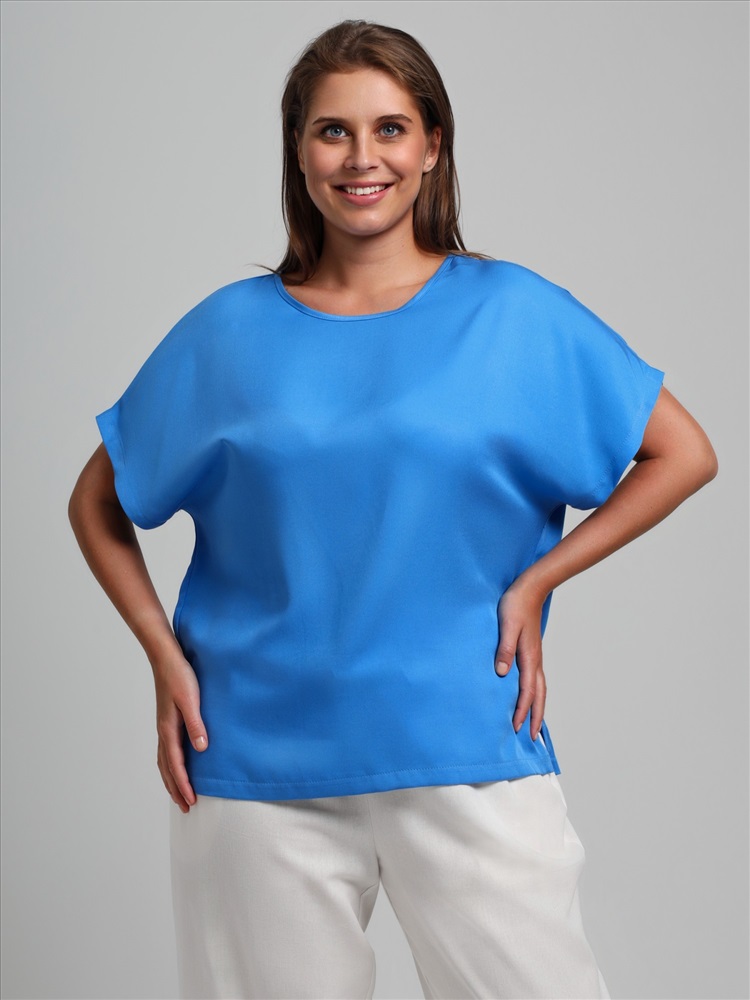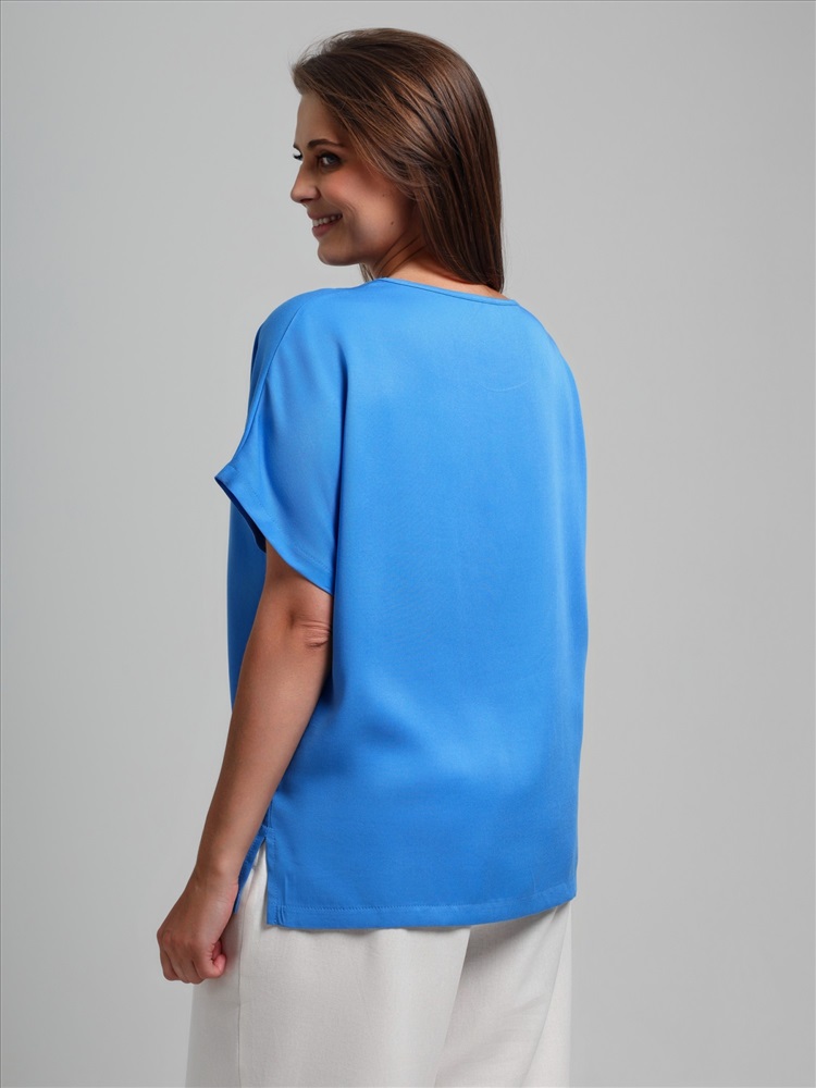 Блуза женская из гладкокрашеного тканого штапельного полотна, прямого силуэта, с горловиной овальной формы и цельнокроеными рукавами. Горловина окантована основным материалом, в боковых швах разрезы.