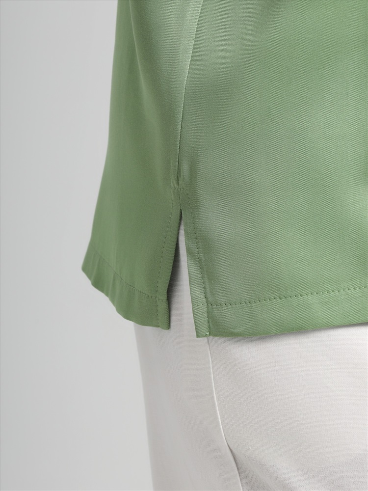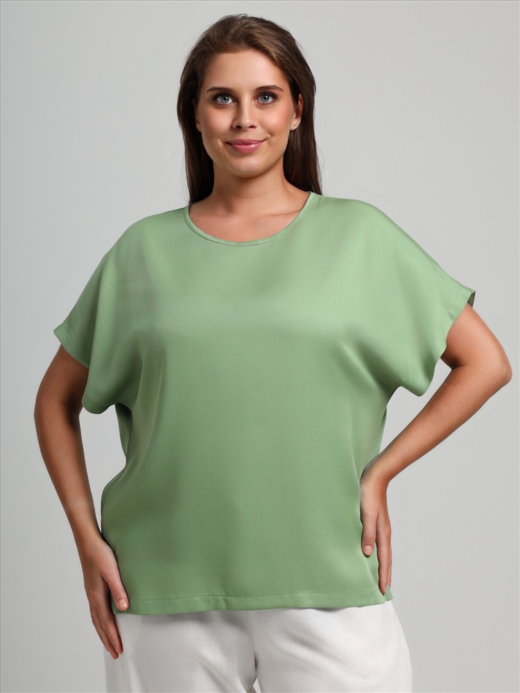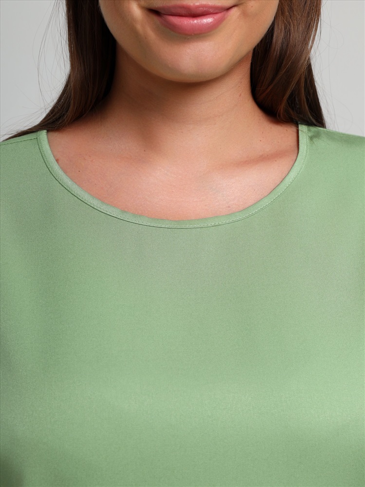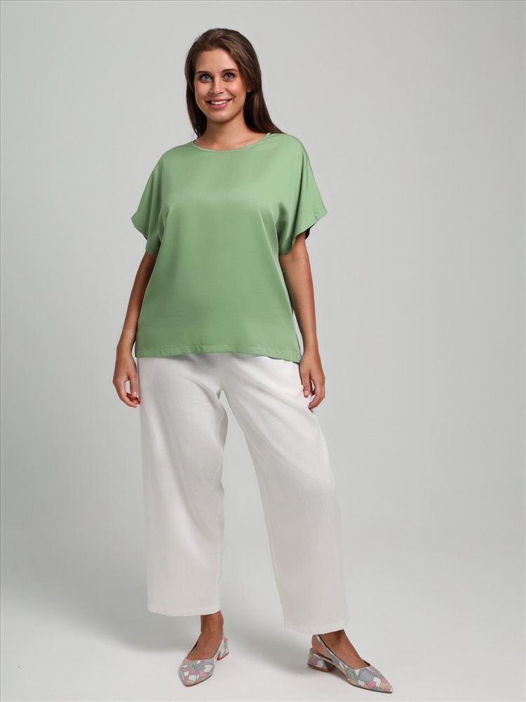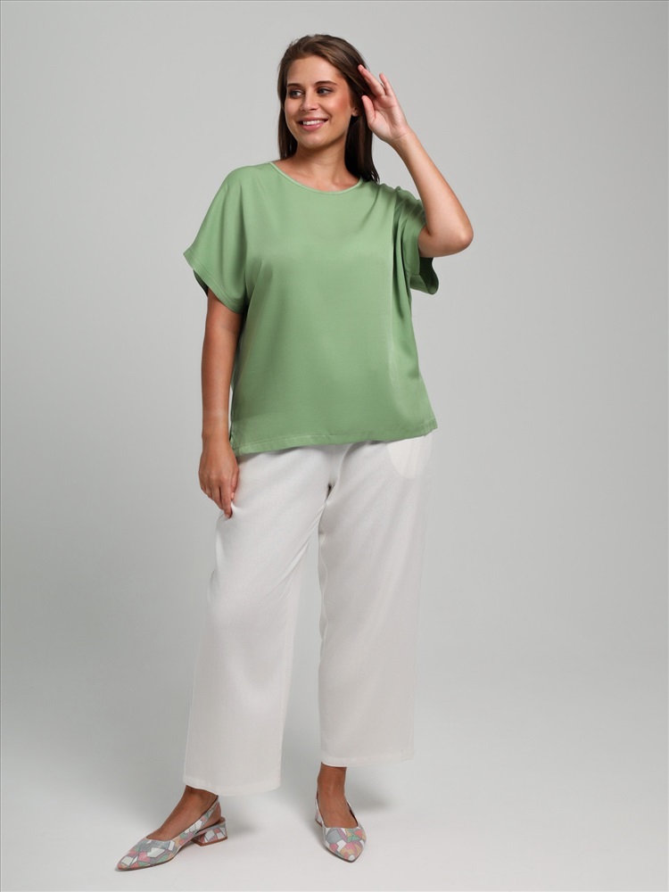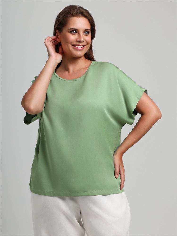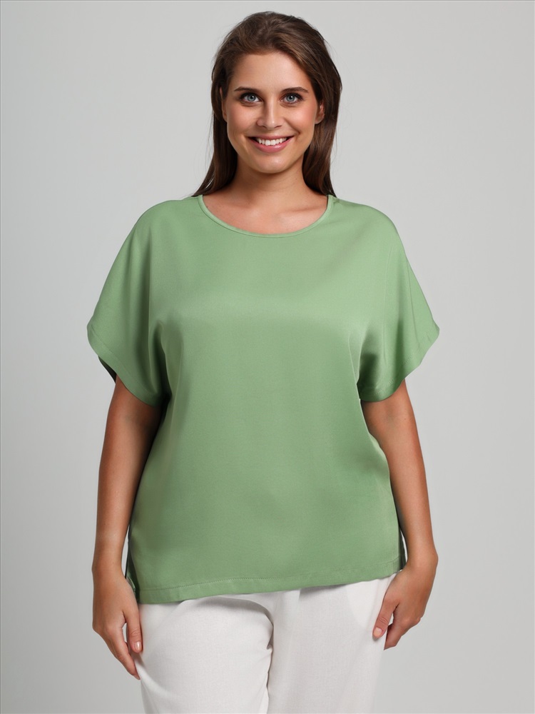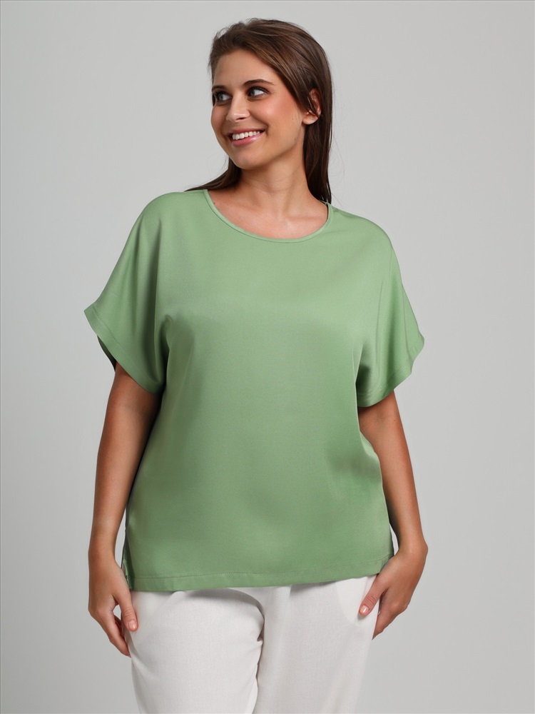 Блуза женская из гладкокрашеного тканого штапельного полотна, прямого силуэта, с горловиной овальной формы и цельнокроеными рукавами. Горловина окантована основным материалом, в боковых швах разрезы.