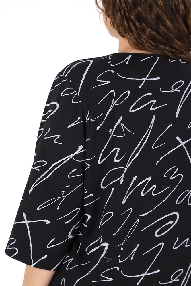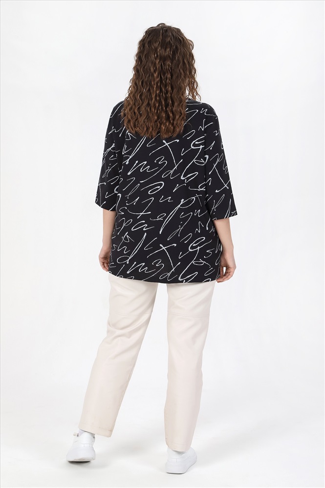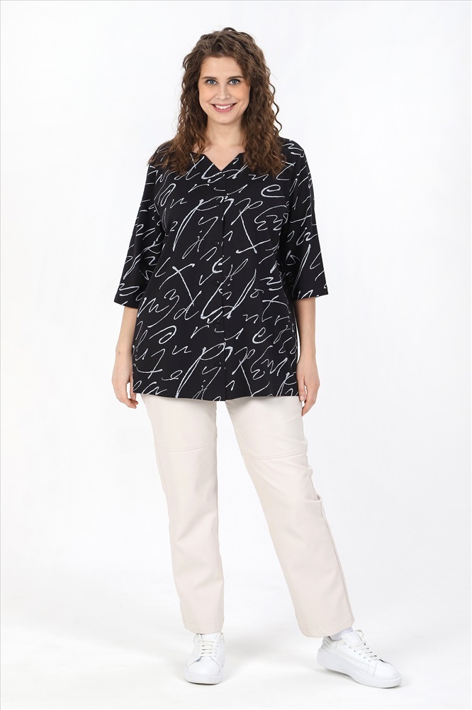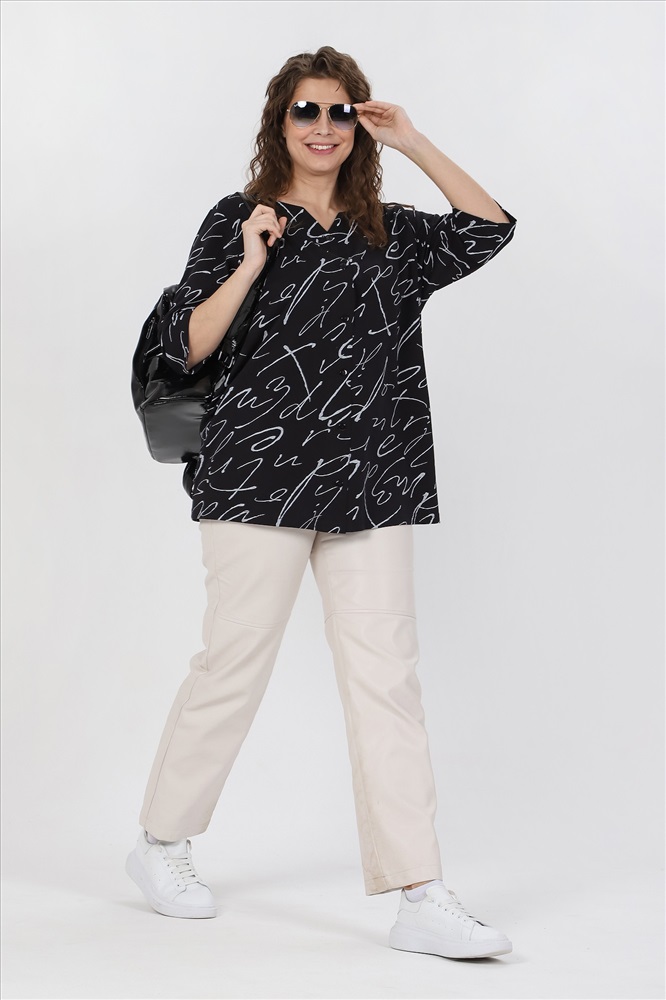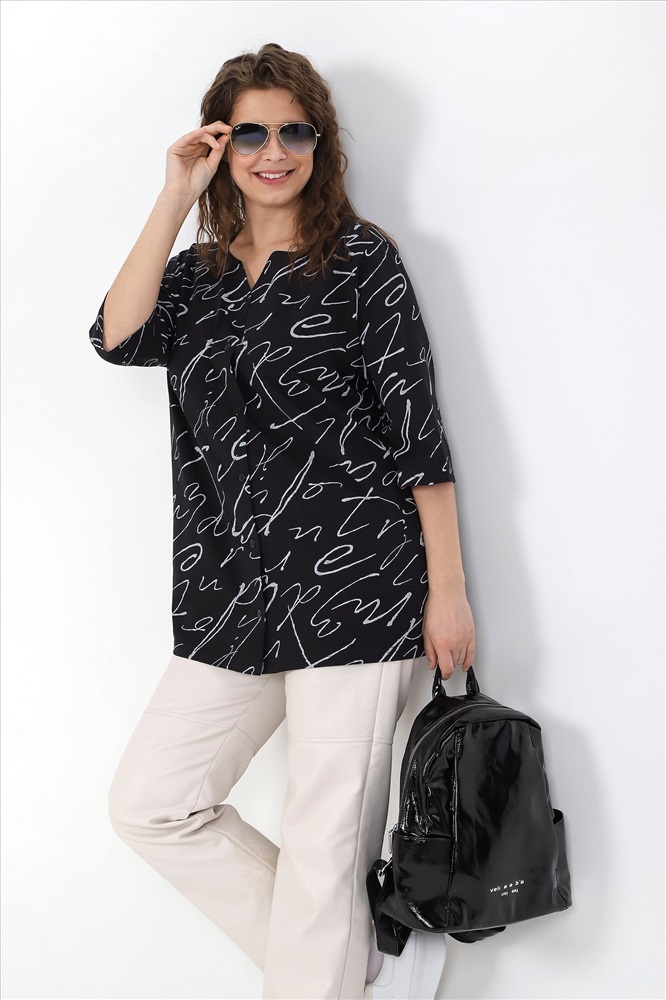 Ткань: Кулирка Кулирка - это самое гладкое и тонкое трикотажное полотно из чистого хлопка. С лицевой стороны ткань «кулирка» выглядит как «вертикальные косички», орнамент изнаночной стороны напоминает «кирпичную кладку». Свойства кулирного трикотажа- воздухопроницаемость, гигроскопичность, не теряя своей формы, практически не тянется в длину и хорошо растягивается в ширину, не образует складки. Блуза женская свободного покроя, из трикотажного полотна «кулирка», с рукавами ¾ длины, центральной бортовой застежкой на петли и пуговицы. V-образная горловина переда обработана обтачками, спинки – окантована.