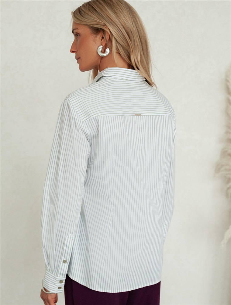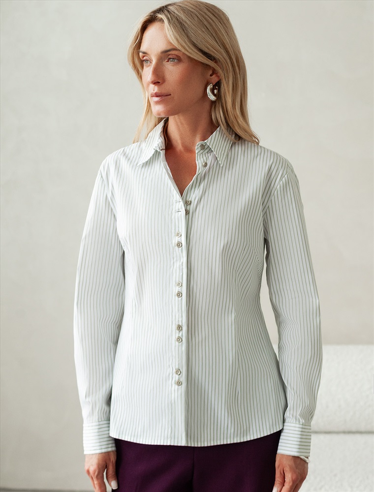 Параметры модели на первом фото: Рост 170, бюст 89, талия 63, бедра 92 Блузка прилегающего силуэта выполнена из формоустойчивого хлопка. Фишкой изделия служат парные контрастные пуговицы. На спинке фирменный металлический логотип бренда. Изделие хорошо держит форму, подчеркивает силуэт и подходит для любой фигуры. Идеальный вариант для респектабельных образов в деловом стиле. Комментарии к товару