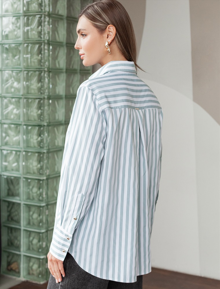 Параметры модели на первом фото: Рост 170, бюст 89, талия 63, бедра 92 Блузка свободного силуэта выполнена из смесовой струящейся ткани. Модель в вертикальную полоску дополнена золотистыми рельефными пуговицами. Свободный силуэт подходит для любой фигуры. Для идеального роскошного образа используйте в качестве низа брюки светлых тонов. На спинке изделия фирменный металлический логотип бренда.