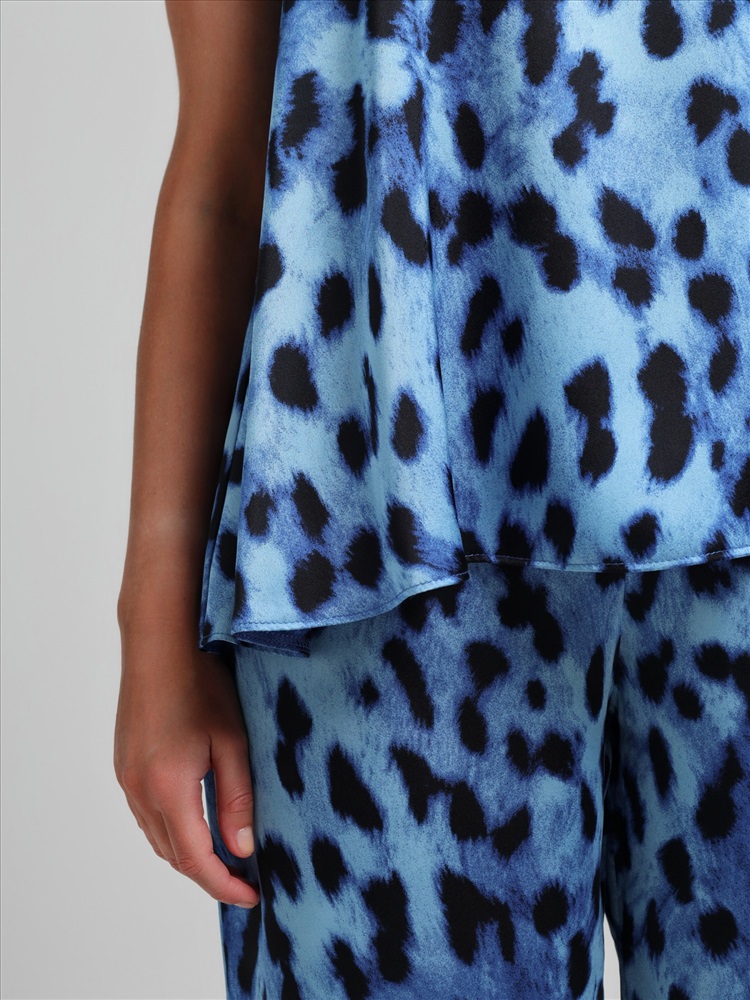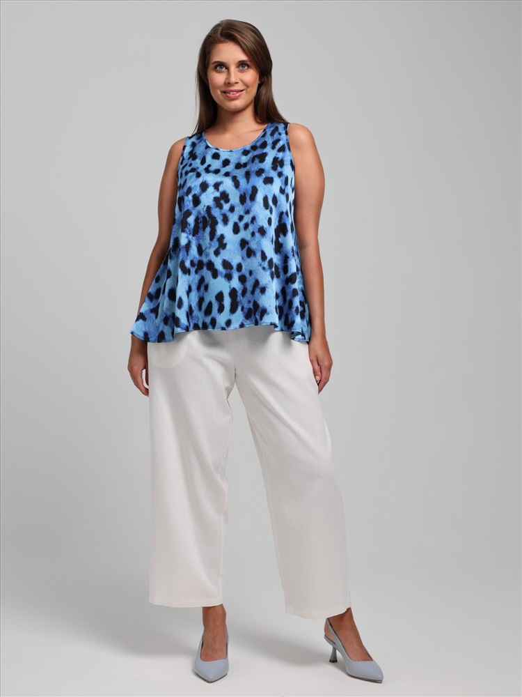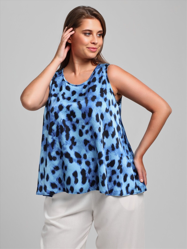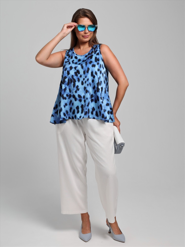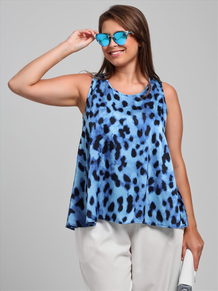 Ткань: Искусственный шёлк Блузка женская из тканого полотна «искусственный шёлк полиэстер» с набивным рисунком, расклешенного силуэта, без рукавов, с овальным вырезом горловины, окантованным основным материалом.