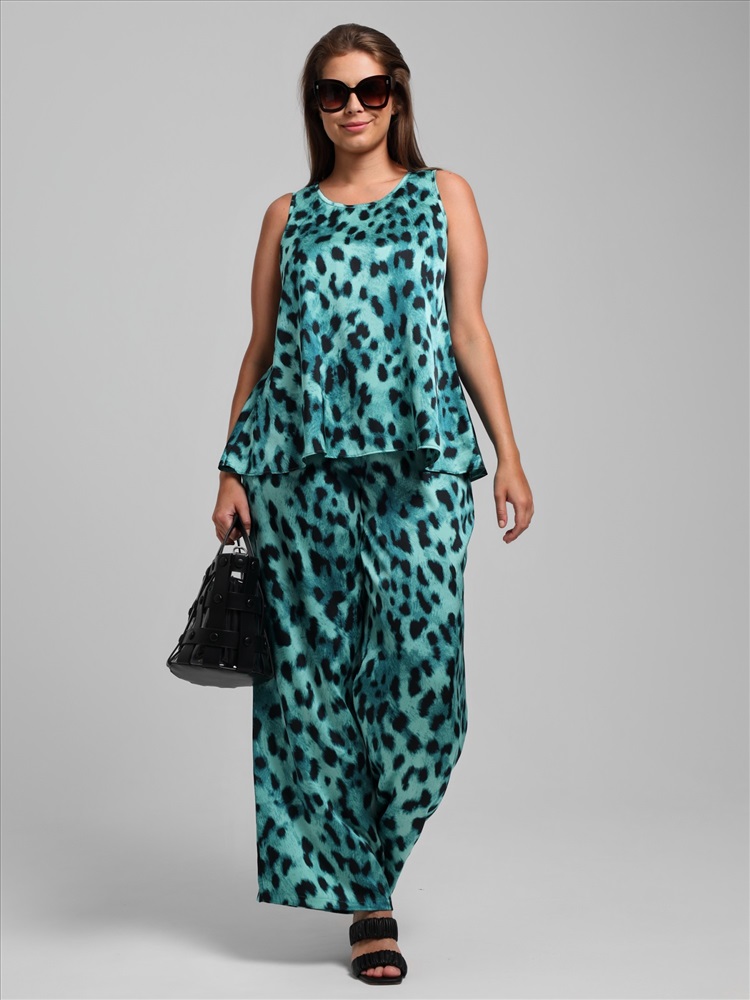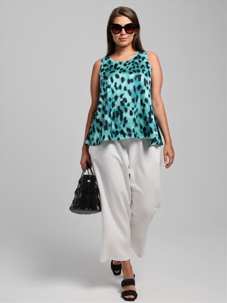 Блузка женская из тканого полотна «искусственный шёлк полиэстер» с набивным рисунком, расклешенного силуэта, без рукавов, с овальным вырезом горловины, окантованным основным материалом.