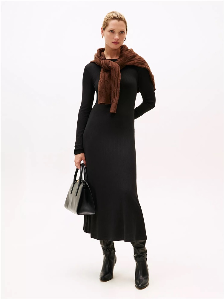 Tommy Hilfiger women's dress. Made from stretchy viscose knit with a subtle rib, this sleek midi dress flows smoothly from its flattering boat neck to its flared hem.