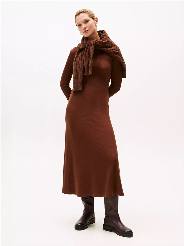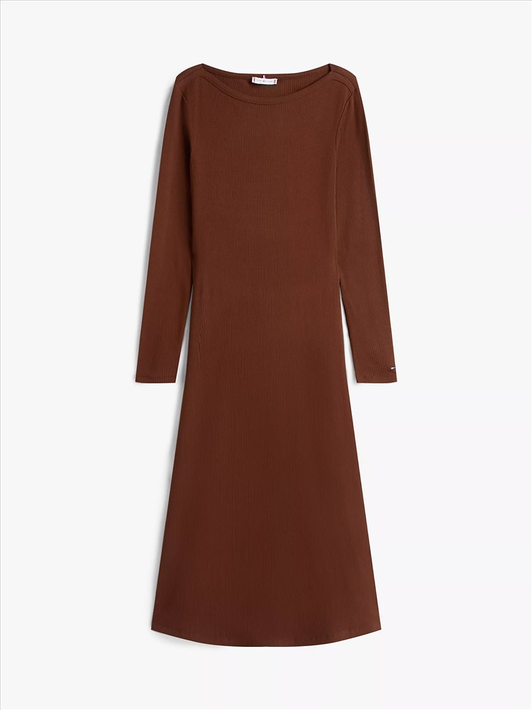 Tommy Hilfiger women's dress. Made from stretchy viscose knit with a subtle rib, this sleek midi dress flows smoothly from its flattering boat neck to its flared hem.