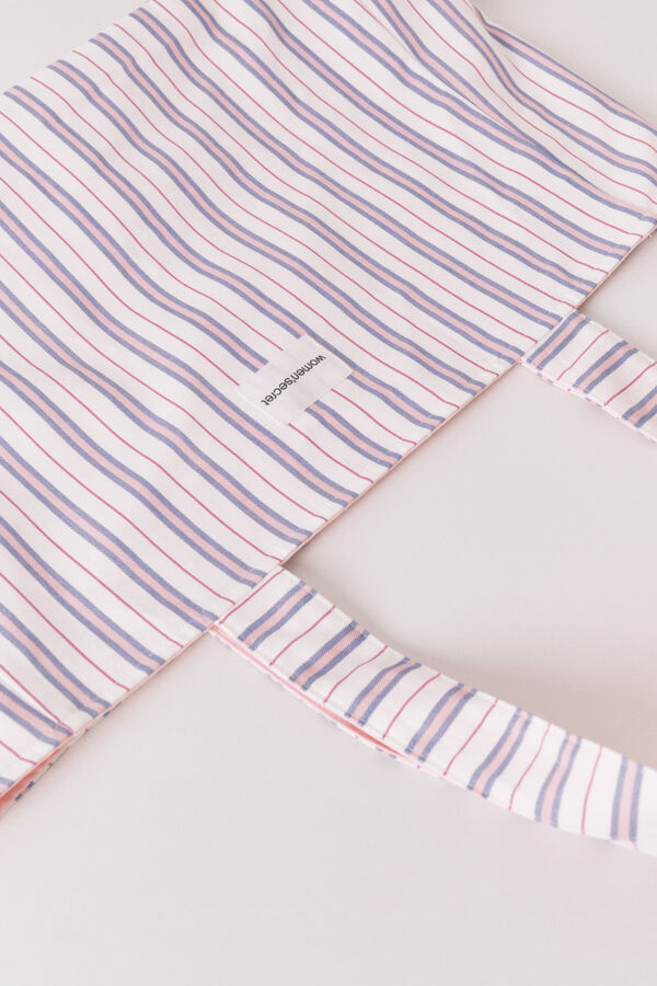 Bolso grande, tipo tote, de tejido algodón con estampado allover de rayas. Súper práctico y ligero, ideal para combinar con todos tus looks IN & OUT.