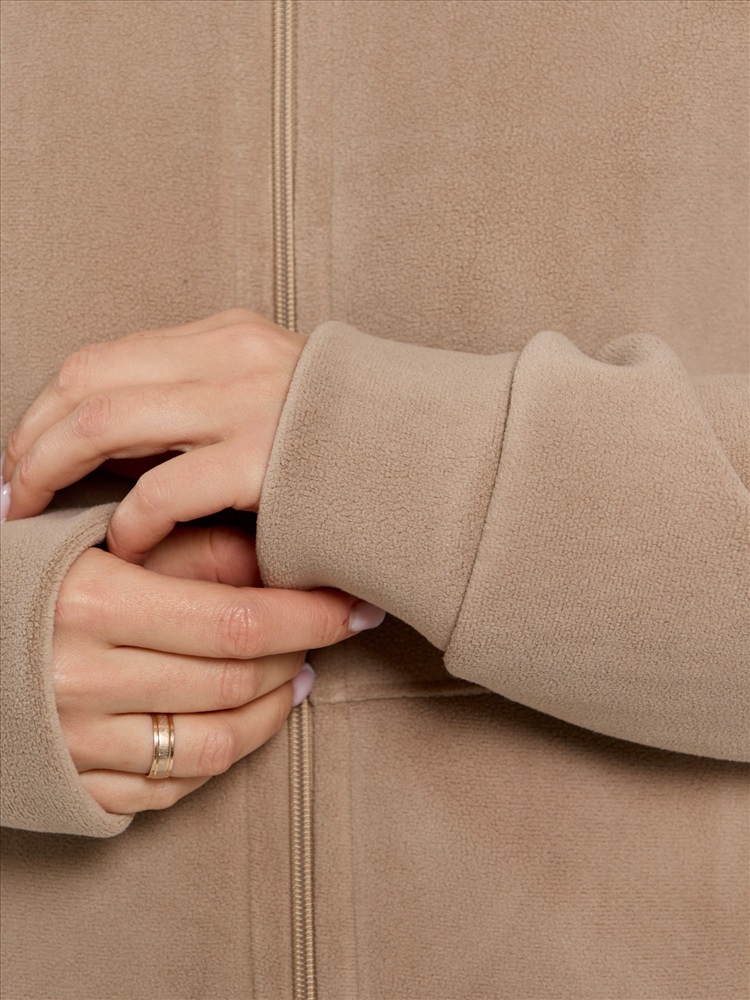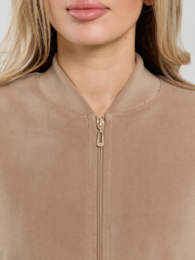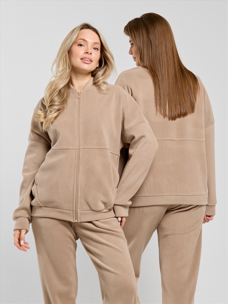 Ткань: Даблфлис Куртка-бомбер – молодежная из гладкокрашенного трикотажного полотна «дабл-флис» (двухсторонний флис) прямого силуэта, свободная, с длинными втачными рукавами, горловиной овальной формы, обработанной втачной планкой, центральной бортовой застежкой на тесьму «молния». Полочка и спинка состоят из двух деталей, низ изделия с притачным поясом, рукава с притачными манжетами. Пояс, планка горловины, манжеты рукавов выполнены из основного материала.