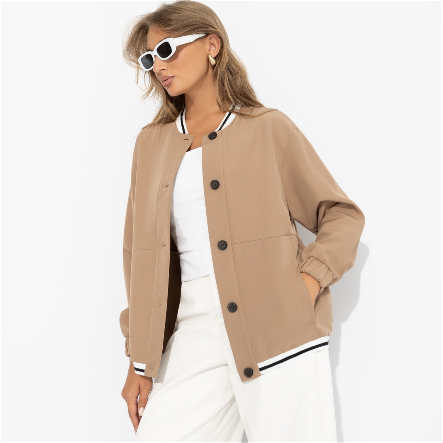 Состав: «Барби» (60% п/э, 37% вискоза, 3% спандекс) Плотность ткани: Средняя Тип ткани: Текстиль Вид застежки: Пуговица/-ы Дополнительный цвет ткани: Белый Карманы: Накладные Основной цвет ткани: Бежевый Отрезная талия: Нет Подклад: Нет Резинка по талии: Нет Рисунок/раппорт: Нет, все изделия идентичны Сезон: Круглогодичный Силуэт: Свободный Стиль: Повседневный Параметры модели на фото: