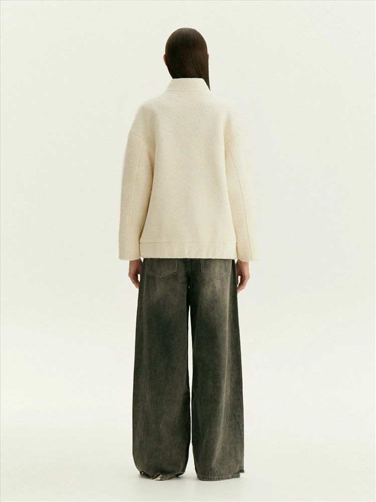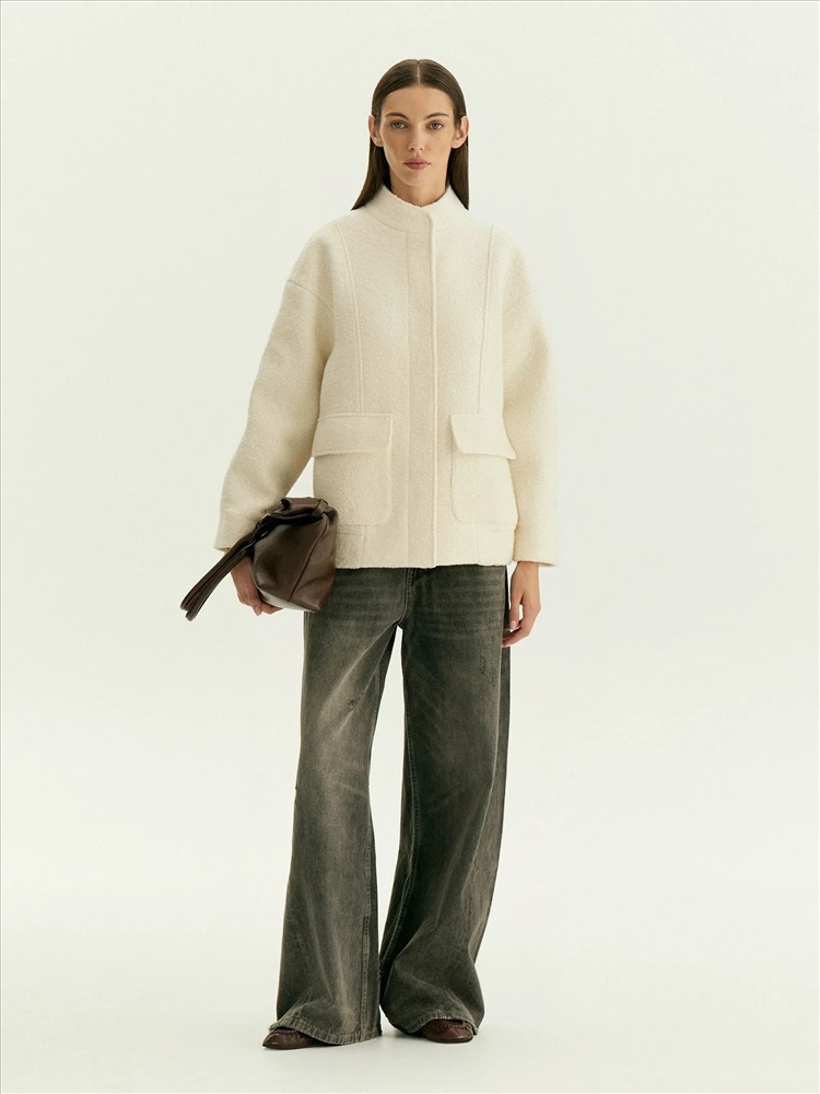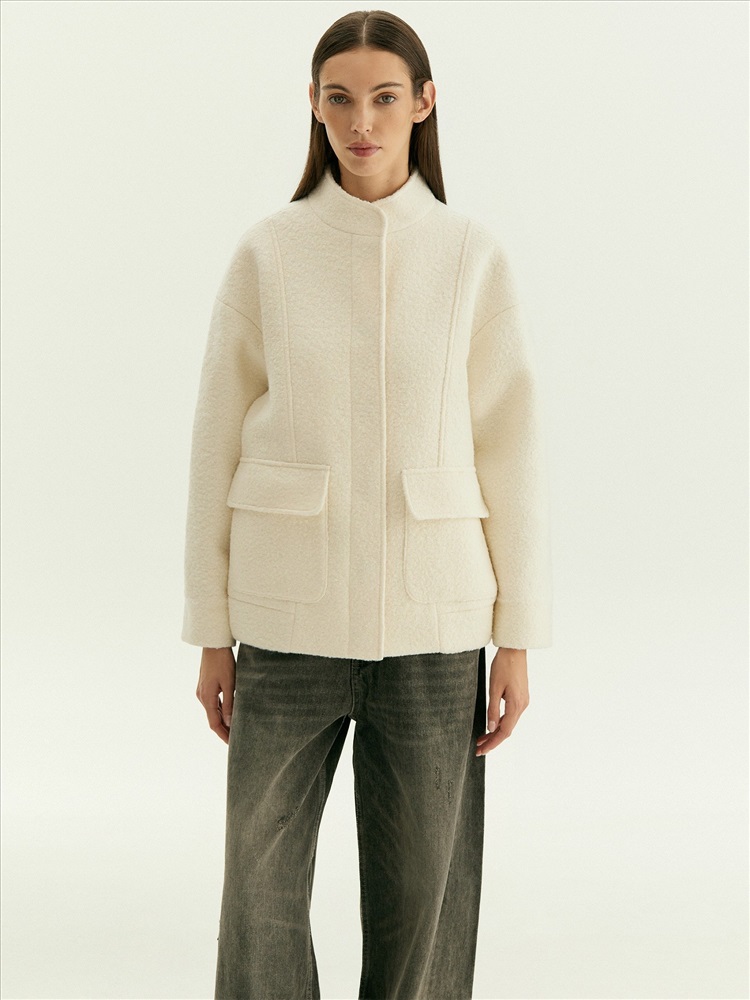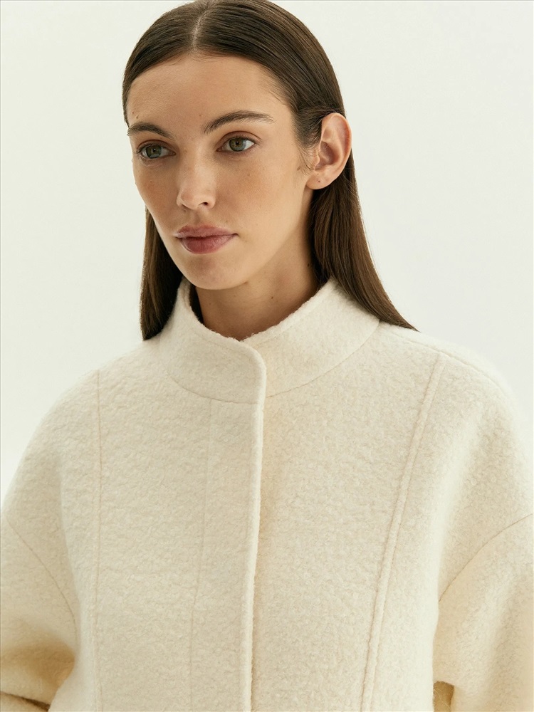 Элегантное сочетание классики и кэжуальности. Уютный материал с мелкими мягкими завитками наполовину состоит из натуральной шерсти, поэтому достойно выглядит и сохраняет тепло. Молочный цвет повышает градус элегантности. Модель на потайных кнопках под планкой и с воротником "мандарин" очень выразительна в своей лаконичности. Плавная спущенная линия плеча и рельефы создают женственный силуэт. Такая вещь поможет создать стильный демисезонный гардероб.